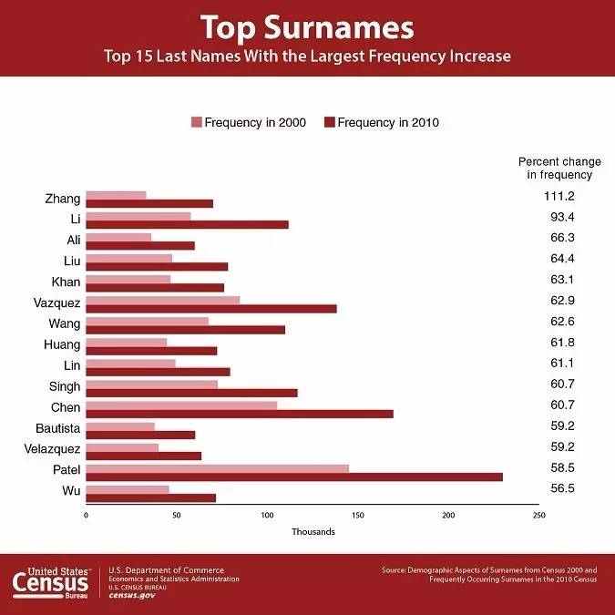 美國人口調(diào)查局發(fā)布了一份1990-2010年間美國人姓氏的變化趨勢,有趣的是最常見的姓前三名排序完全一樣,分別是史密斯(Smith)、約翰遜(Johnson)和威廉姆斯(Williams)。增長最快的15個姓氏中,中國的姓氏占了8席,其中Zhang和Li更是位列前兩名,其他中國姓氏還包括Liu、Wang、Huang、Lin、Chen和Wu。(美通社,2016年12月15日華盛頓)