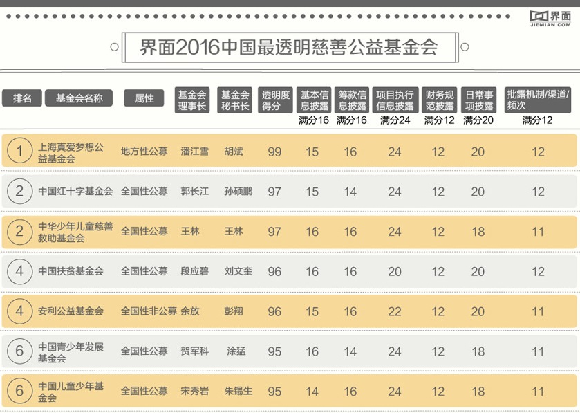 界面發(fā)布了其第一份基金會(huì)榜單——“2016中國(guó)最透明慈善公益基金會(huì)排行榜”。該榜單共有50家基金會(huì)入選,上海真愛(ài)夢(mèng)想公益基金會(huì)作為地方性公募基金會(huì),今年名列榜首,中國(guó)紅十字基金會(huì)和中華少年兒童慈善救助基金會(huì)并列第二。50家基金會(huì)的2015年捐款收入總額為90.1億元,較其2014年的捐款收入總額73.5億元增長(zhǎng)了21.6%。(美通社,2017年1月6日北京)
