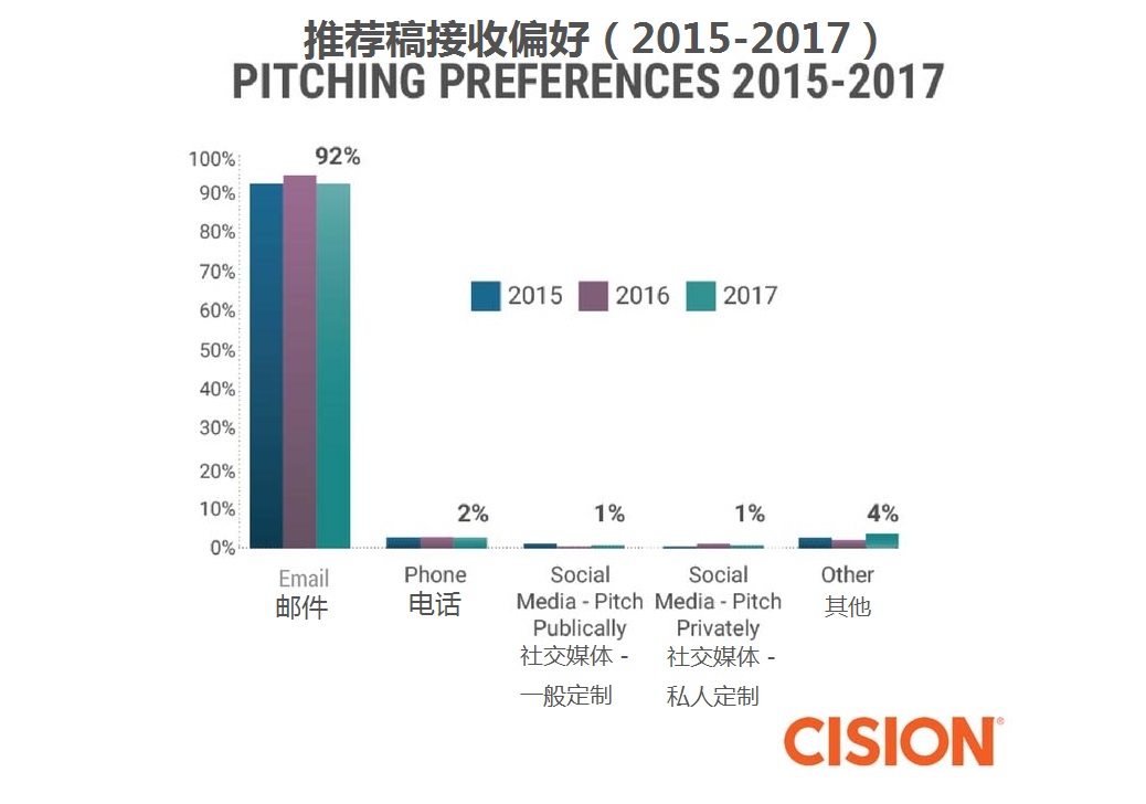 新聞?dòng)浾攥F(xiàn)在更傾向于使用圖片、視頻、信息圖和用戶生成的多媒體內(nèi)容,而不只是數(shù)據(jù)。盡管使用社交媒體的頻率在增加,但只有44%的新聞?dòng)浾哒J(rèn)為社交媒體是可靠的信息來源,這一比例較2016年下降7%。另外,92%的新聞?dòng)浾吒矚g通過電子郵件的方式接收公關(guān)推薦稿,他們對(duì)公關(guān)專員提出的最重要建議是,研究以前的新聞報(bào)道,為新聞?dòng)浾咛峁┧麄兿M吹降亩ㄖ仆扑]稿。(美通社,2017年3月28日芝加哥)
