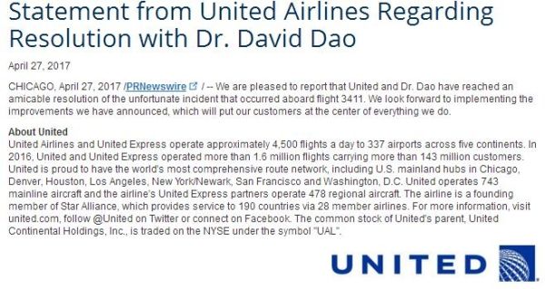 4月9日,美聯(lián)航將一位拒絕放棄座位的亞裔醫(yī)生David Dao暴力拖拽下機(jī),引發(fā)大范圍輿論抗議。27日,美聯(lián)航在通過美通社發(fā)布的一份聲明中表示,已經(jīng)與David Dao達(dá)成和解,但未透露具體金額。同天,美聯(lián)航宣布推出10項(xiàng)整改承諾,除非安全或保安受到威脅,不會要求已經(jīng)登機(jī)的乘客非自愿放棄其機(jī)位,且將提高自愿棄程賠償金的上限至一萬美元。美聯(lián)航在聲明中稱,“我們期待在未來實(shí)施我們已經(jīng)宣布的改進(jìn)措施,這將使顧客成為我們一切努力的中心。”(美通社,2017年4月27日芝加哥)