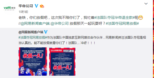 隨著法國(guó)隊(duì)和克羅地亞隊(duì)進(jìn)入到世界杯決賽,圍繞世界杯所進(jìn)行的全民狂歡也進(jìn)入到了最高潮階段。先是蒙牛“我不是天生強(qiáng)大,我只是天生要強(qiáng)”,然后有華帝“法國(guó)隊(duì)奪冠華帝退全款”,不斷激發(fā)了全民參與的積極性。7月12日,一直“各有態(tài)度”的網(wǎng)易也加入其中,“法國(guó)奪冠網(wǎng)易放假”成為今天的社交媒體新熱點(diǎn)。