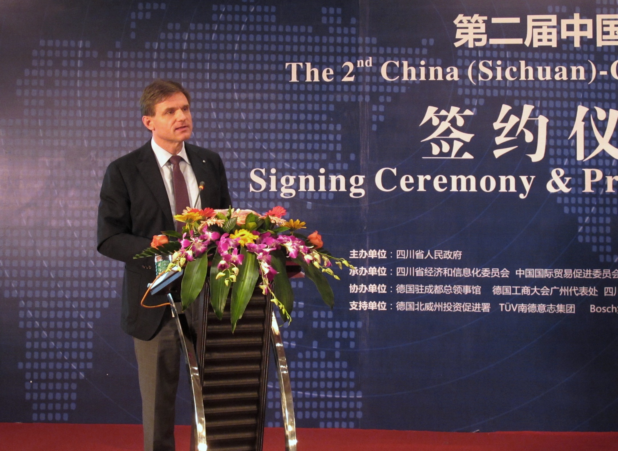 四川成都2011年10月18日電 /美通社亞洲/ -- 繼2010年TUV 南德意志集團(tuán)(以下簡(jiǎn)稱TUV SUD )在第一屆洽談會(huì)中代表德方企業(yè)與四川省機(jī)械研究設(shè)計(jì)院和四川省機(jī)械行業(yè)委員會(huì)簽訂技術(shù)合作諒解備忘錄之后,中德(四川)第二屆機(jī)械合作洽談會(huì)在成都凱賓斯基酒店隆重開(kāi)幕。TUV SUD 大中華集團(tuán)總裁& CEO 范華德(Dirk von Wahl)先生蒞臨會(huì)議現(xiàn)場(chǎng)并發(fā)言。