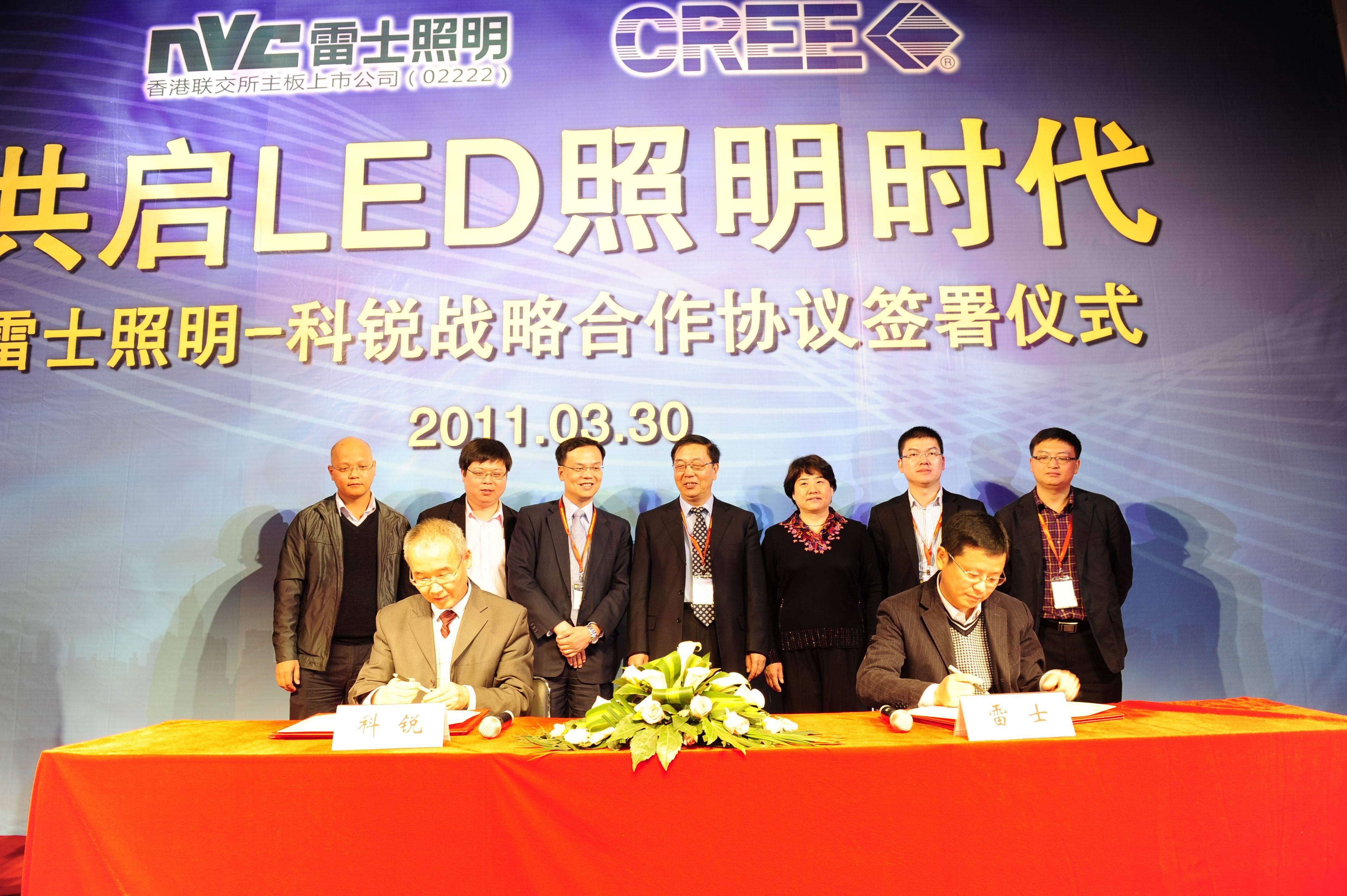 中國(guó)惠州2011年3月31日電 /美通社亞洲/ -- 國(guó)際知名專業(yè)照明企業(yè)雷士照明(香港主板上市代號(hào):2222)與全球LED 照明領(lǐng)域的行業(yè)領(lǐng)先者科銳公司(Nasdaq: CREE) 在上海簽署戰(zhàn)略合作協(xié)議,進(jìn)行強(qiáng)強(qiáng)聯(lián)合,全面推動(dòng)半導(dǎo)體照明產(chǎn)業(yè)的發(fā)展與變革。