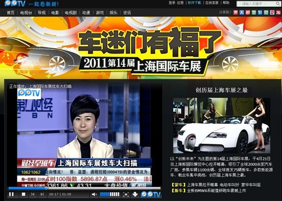 上海2011年4月25日電 /美通社亞洲/ -- 以“創(chuàng)新未來”為主題的2011第十四屆上海國際汽車展覽會于2011年4月21日-4月28日在上海隆重舉行。這是繼 PPTV 網(wǎng)絡(luò)電視連續(xù)4年成功直播車展后,再次以網(wǎng)絡(luò)電視直播新媒體的身份入駐本次上海車展第一現(xiàn)場。此外,PPTV 網(wǎng)絡(luò)電視上海車展專題頁面已首發(fā)上線(http://news.pptv.com/dsj/2011zt/2011shcar/index.html),第一時間全線報道本屆車展的四大精彩看點,讓廣大車迷們大飽眼福。