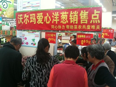 此外,一些城市的沃爾瑪還舉行了蔬菜義賣活動,把義賣所得全額捐給農(nóng)民。受年初低氣溫影響,湖北當(dāng)陽市的萵筍上市期延后,導(dǎo)致8000多萬斤的萵筍同時上市。湖北沃爾瑪立即和宜昌及當(dāng)陽市商務(wù)局聯(lián)系,緊急采購滯銷萵筍16噸,并在湖北的十幾家沃爾瑪門店開展“買一棵萵筍 獻(xiàn)一份愛心”活動。宜昌的兩家沃爾瑪門店還舉辦了“把義賣所得全額返還農(nóng)戶”的萵筍義賣活動,顧客紛紛“捐款”?;顒赢?dāng)天募集的近千元善款已通過宜昌市慈善總會捐贈給當(dāng)陽“萬隆豐”農(nóng)村專業(yè)合作社,用于支持農(nóng)業(yè)再生產(chǎn)。