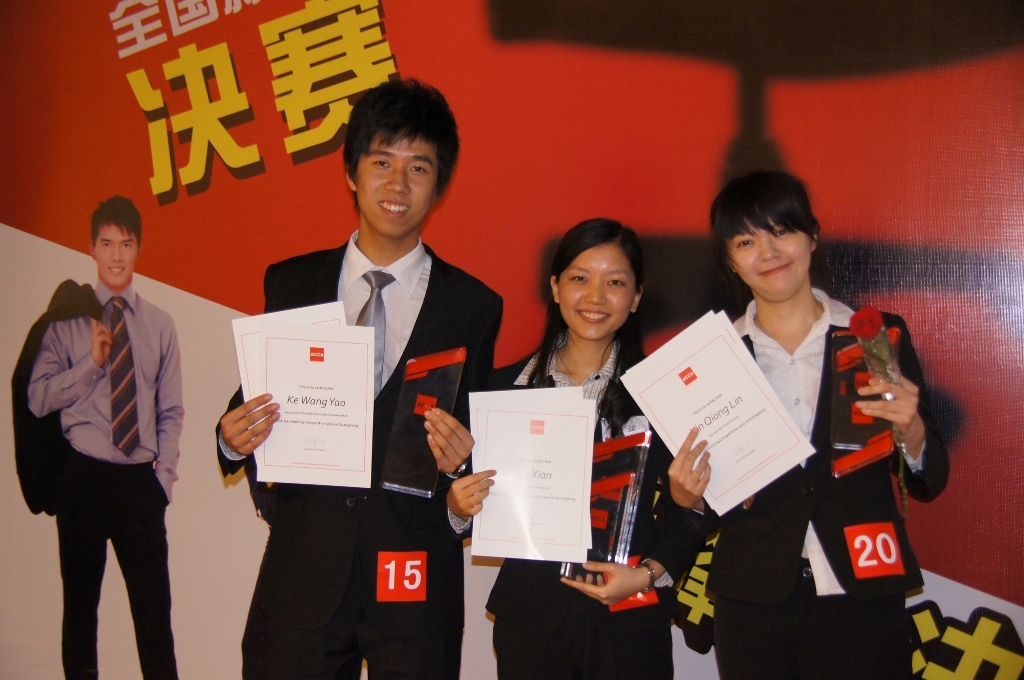 胡弦同學是暨南大學國際學院的大三學生,在班級中成績排名在前2%。她出眾英語能力深受評委們贊賞,此前還曾獲得廣東省大學生英語演講比賽第一名和全國 CCTV 英語演講比賽優(yōu)勝獎。決賽之前,她就曾經(jīng)在4月16日 ACCA 就業(yè)力大比拼前20選手“職業(yè)訓練營”的人際交往練習環(huán)節(jié)中獲得選手們共同票選的第一名。當時選手們的職業(yè)訓導導師程煜麟先生總結(jié)了選手們的意見,認為胡弦獲勝的原因在于她在與人交談時始終表現(xiàn)出淡定、大方、誠懇和自信,讓與之交談的人感覺如沐春風。亞軍柯汪堯同學也是一名大三學生,現(xiàn)就讀于廣東外語外貿(mào)大學國際商務英語學院國際貿(mào)易專業(yè),他在密鑼緊鼓準備比賽的同時還在廣交會實習,毅力過人的他克服了時間的困難,帶領比賽團隊出色地完成項目,最終以成熟自信的表現(xiàn)獲得評委一致好評。與亞軍來自同一學院的辛瓊璘同學是國際商務(全英班)的學生,她親切大方的形象、良好的團隊合作精神和敏捷的才思令評委們留下深刻印象。