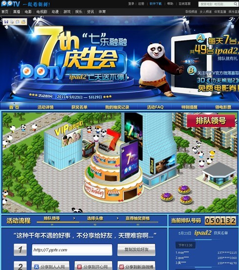 截止到29日活動結束還有6天時間,用戶凡是登錄 PPTV 網(wǎng)絡電視官網(wǎng),進入活動頁面點擊參與活動加入排隊流程,便會得到一個排隊號,號碼每逢7的倍數(shù)即有機會參與抽獎。為了讓后續(xù)的活動中獎幾率保持如活動開始時一樣,當天的抽獎號碼如未中獎,當天獎池內便會清空一次,以確保活動第二天網(wǎng)友均有機會獲得 PPTV 送出的7臺 iPad 大獎和千張電影券,也就是說網(wǎng)友們可以連續(xù)7日排隊拿大獎,iPad2 送不停。