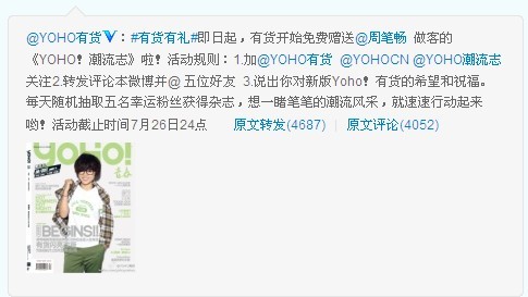 為了慶祝和宣傳 Begins 入駐 Yoho!有貨,早在7月20日,Yoho!有貨官方微博暨發(fā)起了轉發(fā)“Begins 入駐 Yoho!有貨,贈送周筆暢封面雜志《Yoho!潮流志》“活動。截止到今天共有4600多條轉發(fā),4000余條評論,加上此前發(fā)布的 Begins 正式入駐 Yoho!有貨新聞消息,共有5萬余人參與了微博的轉發(fā),評論量更是達到了3萬余條。沒想到粉絲們的力量是如此強大,正是借助于微博傳播,在周筆暢、Begins、Yoho 的貼吧粉絲們也是自覺將 Begins 的最新消息與其他筆迷們分享。
