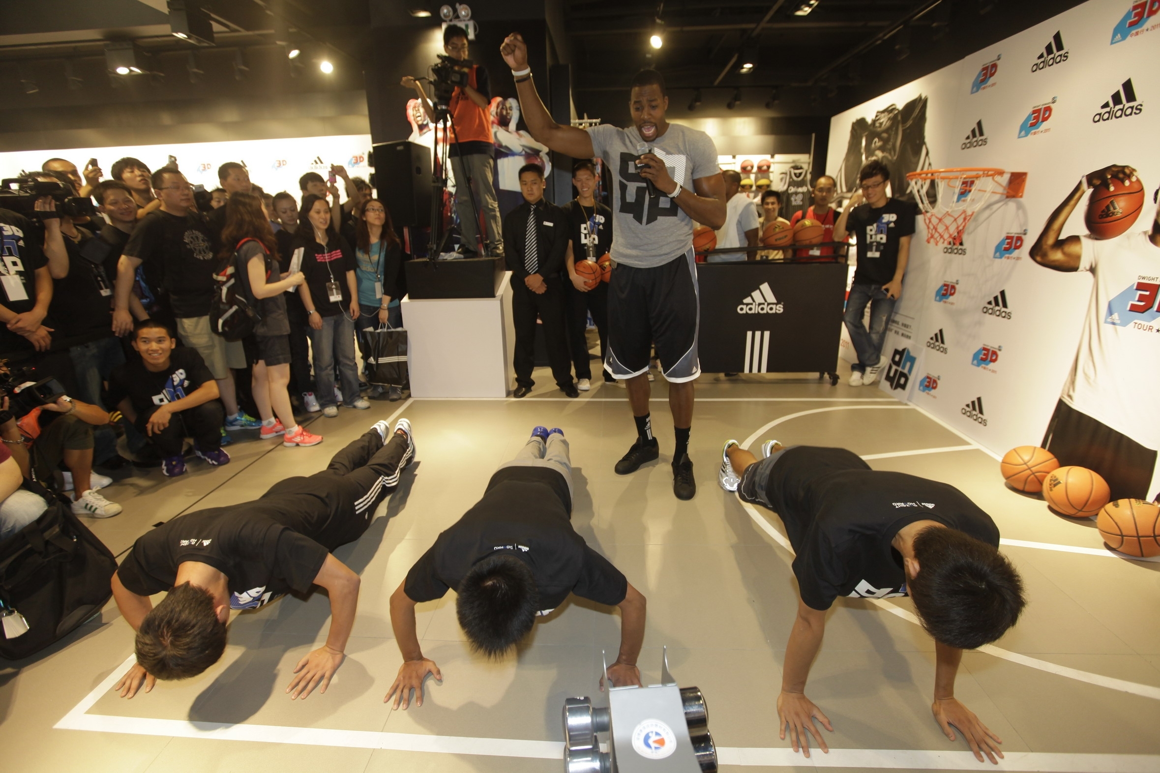 武漢的球迷對于這位 NBA 的魔獸似乎有著特別高的熱情?;顒舆€沒開始,漢江路阿迪達(dá)斯迷你旗艦店的門口就已經(jīng)擠滿了渴望與霍華德零距離接觸的球迷們。伴隨著現(xiàn)場主持與球迷們有節(jié)奏地呼喊,3D 魔獸終于出現(xiàn)。這位 NBA 力量的化身來到武漢,當(dāng)然也不會吝惜與現(xiàn)場球迷來一場“強(qiáng)人三項”的力量較量:比賽限時兩分鐘,手舉10次啞鈴后完成5次仰臥起坐,然后再進(jìn)行仰臥投籃,規(guī)定時間內(nèi)投籃進(jìn)球最多者即獲勝。霍華德在了解完游戲規(guī)則后,一馬當(dāng)先,率先要求計時挑戰(zhàn)。3D 魔獸對于完成一整套環(huán)節(jié)表示毫無壓力,他表示相比球場上的訓(xùn)練強(qiáng)度,這個游戲顯得既輕松又好玩。然而對于參賽的小球迷而言,啞鈴和仰臥起坐已經(jīng)十分消耗耐力,最后還需要仰臥投籃,幾個回合下來便已經(jīng)氣喘吁吁。搞怪魔獸在鼓勵球迷的同時還不忘對他們進(jìn)行調(diào)侃,要求小球迷回去多加訓(xùn)練,希望下次有機(jī)會驗收成果。