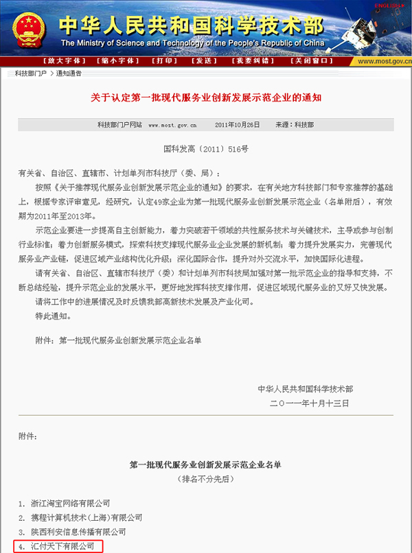 上海2011年10月27日電 /美通社亞洲/ -- 2011年10月26日,科技部網(wǎng)站最新刊登《關(guān)于認(rèn)定第一批現(xiàn)代服務(wù)業(yè)創(chuàng)新發(fā)展示范企業(yè)的通知》,匯付天下有限公司(以下簡(jiǎn)稱(chēng)“匯付天下”)作為第三方支付企業(yè)的唯一代表,名列其中。