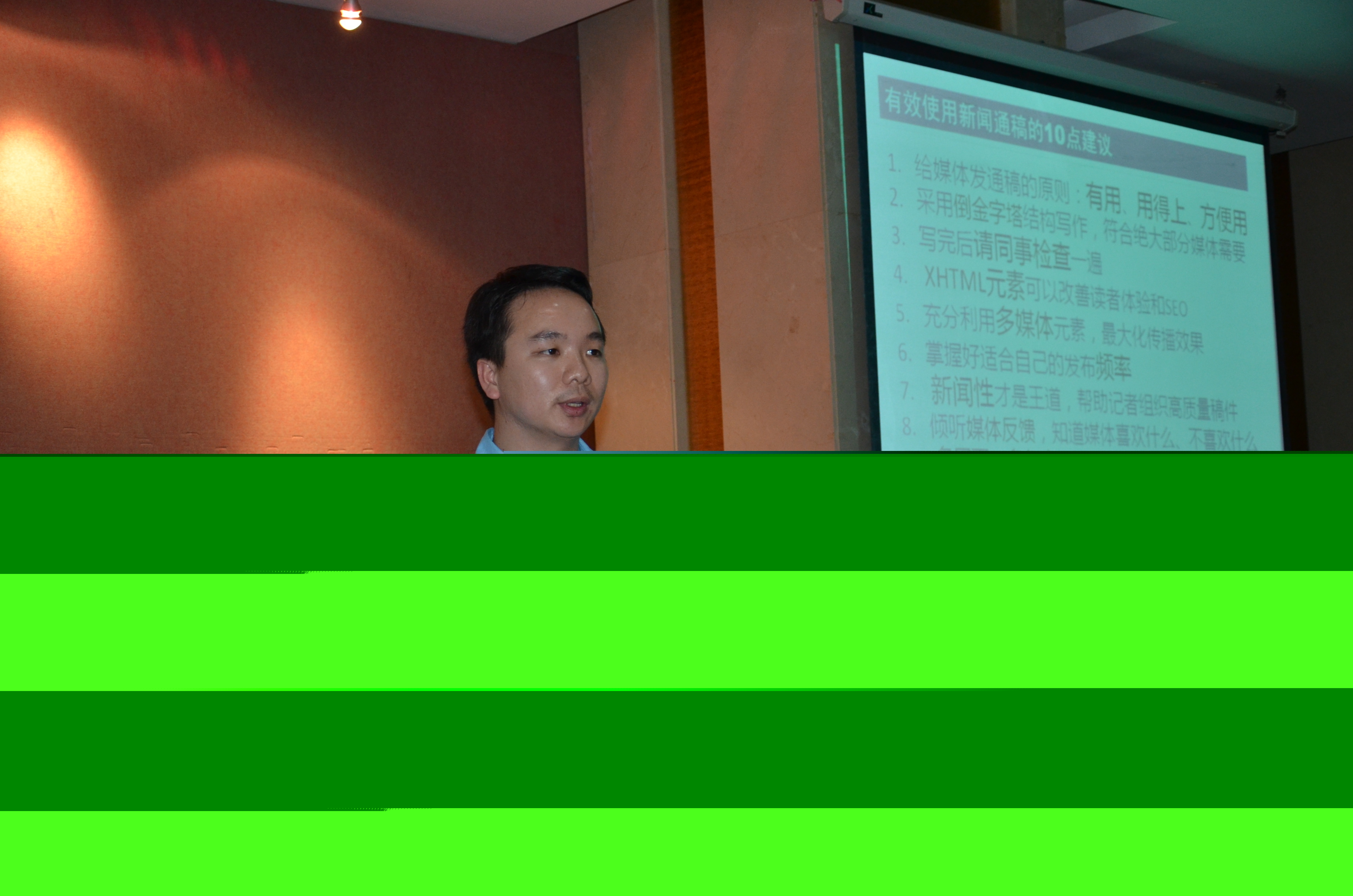 此外,楊成還以實際案例解讀,和大家分享了如何寫好和改寫新聞通稿標題、導語等核心部分;如何充分利用 XHTML、多媒體元素的新技術,既提高文章的可讀性,也幫助改善公司網(wǎng)站在搜索引擎中的表現(xiàn);并根據(jù)美通社針對2,000多名中國媒體編輯和記者所作的調(diào)查,剖析了中國媒體的喜好和習慣。