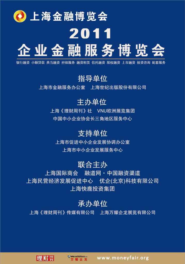 2011企業(yè)金融服務博覽會是在上海市促進中小企業(yè)發(fā)展協(xié)調(diào)辦公室、上海市中小企業(yè)發(fā)展服務中心的指導下,上?!独碡斨芸飞?、VNU 歐洲展覽集團、中國中小企業(yè)協(xié)會長三角地區(qū)服務中心共同主辦。