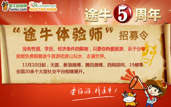 北京和上海2011年11月21日電 /美通社亞洲/ -- 途牛旅游網(wǎng)推出5周年系列活動(dòng)–“途牛體驗(yàn)師”PK 賽,看到招募令中“游遍全世界的夢(mèng)”如此美好的字眼,環(huán)游世界的夢(mèng)想是否也曾在腦海中浮現(xiàn)?是否也向往碧海白沙的悠閑與愜意,向往祖國(guó)山川的壯闊與秀麗?“途牛體驗(yàn)師”,讓夢(mèng)想輕松實(shí)現(xiàn)!