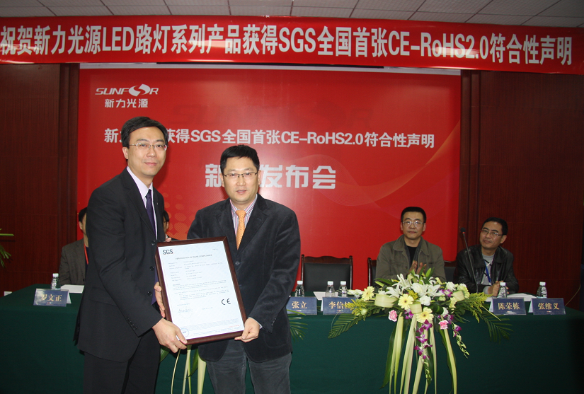 成都2011年11月18日電 /美通社亞洲/ -- 由全球領(lǐng)先的檢驗(yàn)、鑒定、測(cè)試和認(rèn)證機(jī)構(gòu) SGS 通標(biāo)標(biāo)準(zhǔn)技術(shù)服務(wù)有限公司(以下簡(jiǎn)稱(chēng) SGS)與四川新力光源有限公司(以下簡(jiǎn)稱(chēng)新力光源)共同舉辦的“新力光源榮獲 SGS 全國(guó)首張CE-RoHS2.0符合性聲明新聞發(fā)布會(huì)”在成都隆重舉行。典禮現(xiàn)場(chǎng),SGS 科技電子產(chǎn)品事業(yè)部副總監(jiān)李信柱向新力光源頒發(fā)了SGS全國(guó)首張CE-RoHS2.0符合性聲明,新力光源高層領(lǐng)導(dǎo)、成都市高新區(qū)領(lǐng)導(dǎo)及眾多企業(yè)高層代表齊聚現(xiàn)場(chǎng),共同見(jiàn)證這一值得紀(jì)念的歷史性時(shí)刻。
