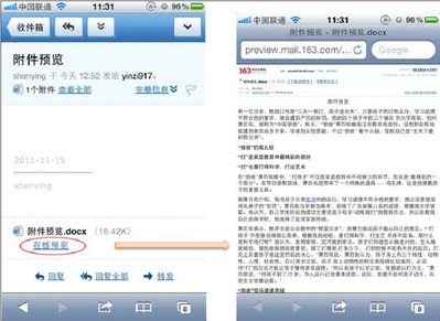 據(jù)網(wǎng)易郵箱產(chǎn)品經(jīng)理介紹,對于網(wǎng)易郵箱(163.com、126.com、yeah.net)的4.3億用戶,只要通過 IMAP 方式收取網(wǎng)易郵箱附件,不管是否安裝任何打開附件的軟件,都可以在手機和 ipad 等終端(包括 PC 客戶端、Android 手機端、iPhone 端、iPad 端的用戶)上在線預(yù)覽附件,不占用各手機和 iPad 的空間,這在國內(nèi)郵箱運營商中屬于首創(chuàng)。