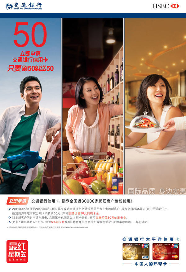2011年12月1日起,交通銀行信用卡展開了聲勢浩大的“刷50送50元”全國性跨年大回饋活動,此次活動聯(lián)合了全國近30,000家優(yōu)質(zhì)商戶,包括“最紅星期五”活動覆蓋全國逾160個城市的3,700多家超市門店和1,700多個加油站商戶、2萬多家精選特惠商戶和交通銀行聯(lián)名信用卡商戶。凡是在2011年12月1日至2012年5月31日期間,成功申請了指定交通銀行信用卡主卡的新客戶,在核卡之日起的45天內(nèi)(含)在上述商戶中任意一家單筆刷卡消費滿50元,就可獲贈50元刷卡金。如同時申請附屬卡,且附屬卡也滿足上述刷卡條件,更可加贈50元刷卡金。