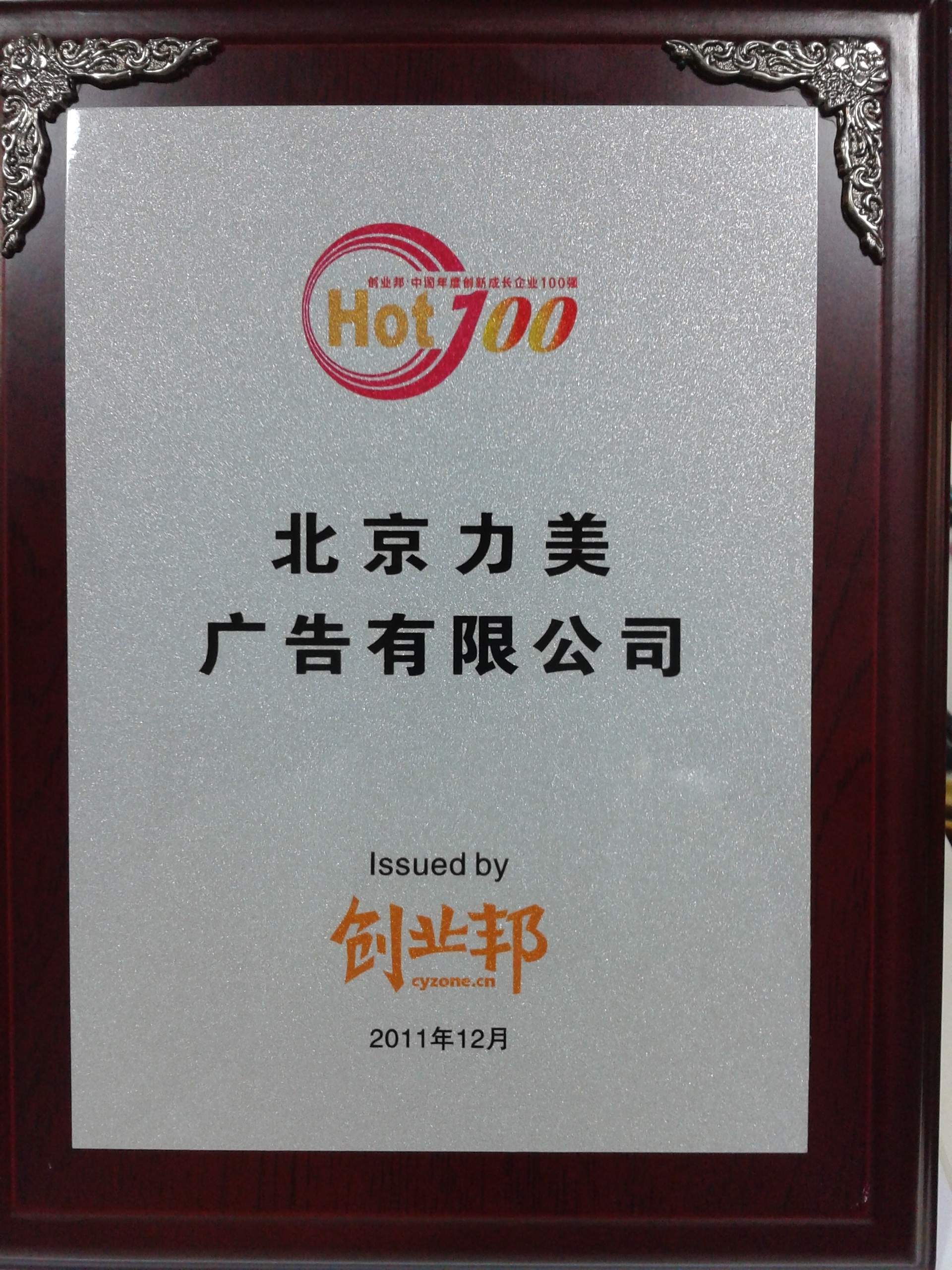 北京2011年12月5日電 /美通社亞洲/ -- 12月2日,“2011創(chuàng)業(yè)邦年會(huì)暨創(chuàng)業(yè)邦100年度頒獎(jiǎng)典禮”上,“創(chuàng)新成長企業(yè)100強(qiáng)”新鮮出爐,北京力美廣告有限公司榜上有名。