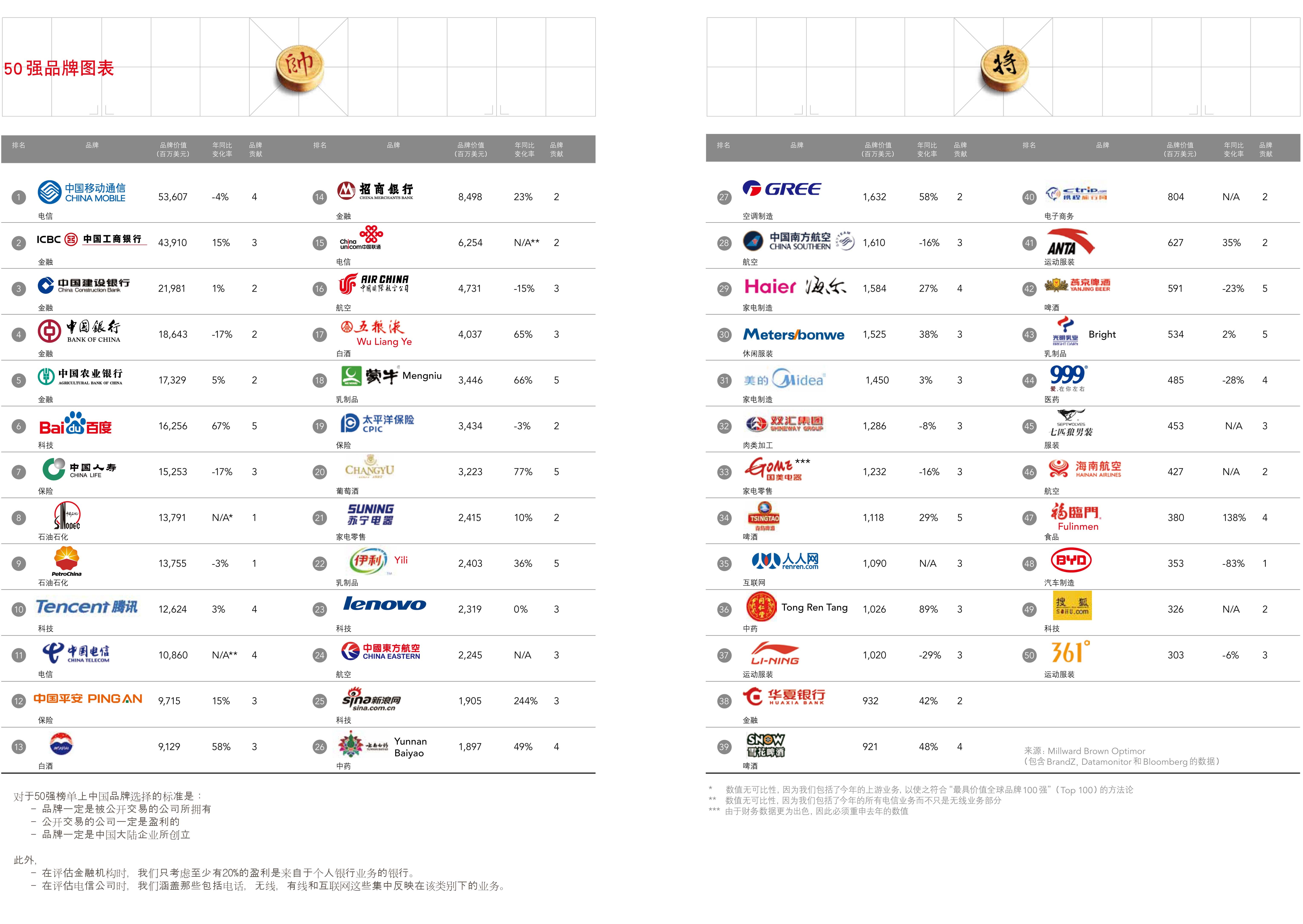 BrandZ? 最具價(jià)值中國品牌50強(qiáng)排行榜是由 Millward Brown 公司為 WPP 旗下運(yùn)營(yíng)公司執(zhí)行的研究項(xiàng)目。此項(xiàng)目是唯一結(jié)合了數(shù)據(jù)超過35,000名中國消費(fèi)者的調(diào)查的品牌資產(chǎn)與對(duì)每家公司的財(cái)務(wù)及經(jīng)營(yíng)成果的嚴(yán)格分析(數(shù)據(jù)來自 Bloomberg 和 KantarWorldpanel)的研究調(diào)查,分隔品牌在推動(dòng)品牌業(yè)務(wù)收入及資本市場(chǎng)的價(jià)值。