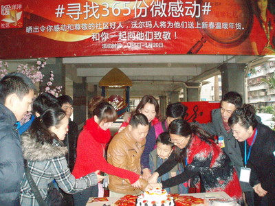 網(wǎng)友可以關(guān)注“@社區(qū)暖洋洋”,2012年1月5日起至20日期間,分享社區(qū)或社會上個人或家庭感人的故事。365個真實、感人、關(guān)注度高的微感動故事的主人公將贏得沃爾瑪代表網(wǎng)友送上的溫暖年貨。他們平凡而偉大的草根公益之愛將使龍年的春節(jié)充滿溫暖。