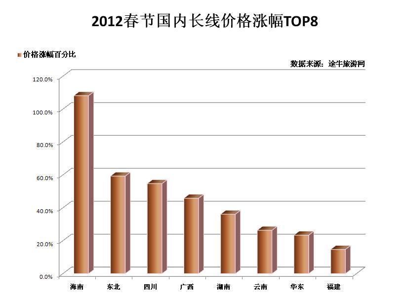 國(guó)內(nèi)游方面,華北、海南、四川等熱門方向漲幅也不容小覷,如上海出發(fā)至四川方向的雙飛6日線路,全年平均價(jià)格在2500元左右,春節(jié)期間價(jià)格在4000元左右;上海至華北方向的春節(jié)價(jià)格漲幅也在1000-2000元不等?!敖衲甏汗?jié)上海市民出境游相對(duì)明顯,去往海南方向的人數(shù)占比較春節(jié)前倒是略有下降,這與上海市民較為成熟的出游觀念是分不開的,錯(cuò)峰出游,避開熱門方向的最熱時(shí)段,能夠更好地享受旅游目的地的服務(wù)和風(fēng)景,”途牛旅游網(wǎng)工作人員建議市民在選擇旅游目的地時(shí),如有條件盡量避開“人潮洶涌”的過熱方向。