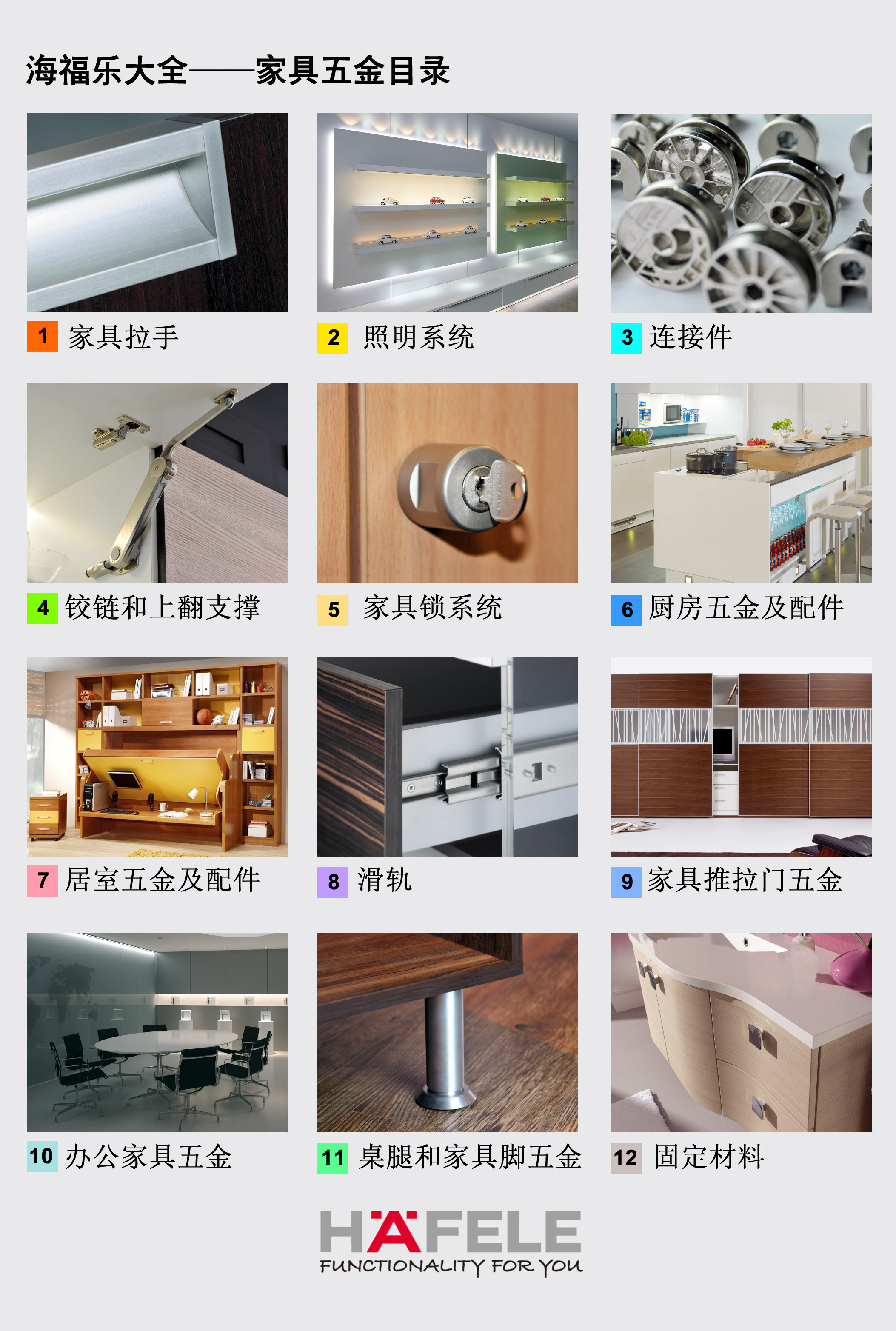 作為全球第一家提出五金“功能性”理念的企業(yè),海福樂不斷調(diào)整其產(chǎn)品種類,為采購人員和室內(nèi)設計師提供解決方案和設計靈感。此次,海福樂針對中國市場,在600多頁的產(chǎn)品手冊中收納產(chǎn)品3000余種,涵蓋了家具及家居中的方方面面,如家具拉手、照明系統(tǒng)、連接件、鉸鏈和翻門支撐、家具鎖系統(tǒng)、廚房五金及配件、居室五金及配件、滑軌、家具推拉門五金、辦公家具五金、桌腿和家具腳五金以及固定材料(PVC、螺釘和膠粘劑)。