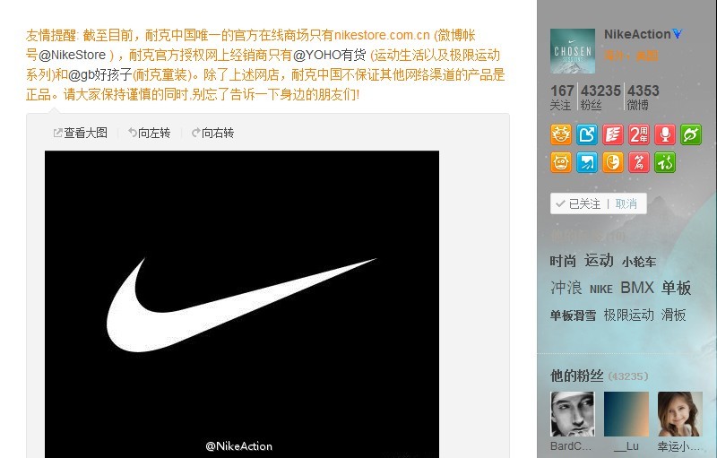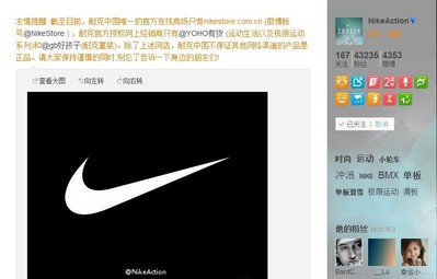 微博原文:“友情提醒:截至目前,耐克中國唯一的官方在線商場只有 nikestore.com.cn,耐克官方授權(quán)網(wǎng)上經(jīng)銷商只有‘YOHO!有貨’(運(yùn)動生活系列及極限運(yùn)動系列)和‘好孩子’(耐克童裝)。除上述網(wǎng)店,耐克中國不保證其他網(wǎng)絡(luò)渠道的產(chǎn)品是正品。請大家保持謹(jǐn)慎的同時(shí),別忘了告訴一下身邊的朋友們!”