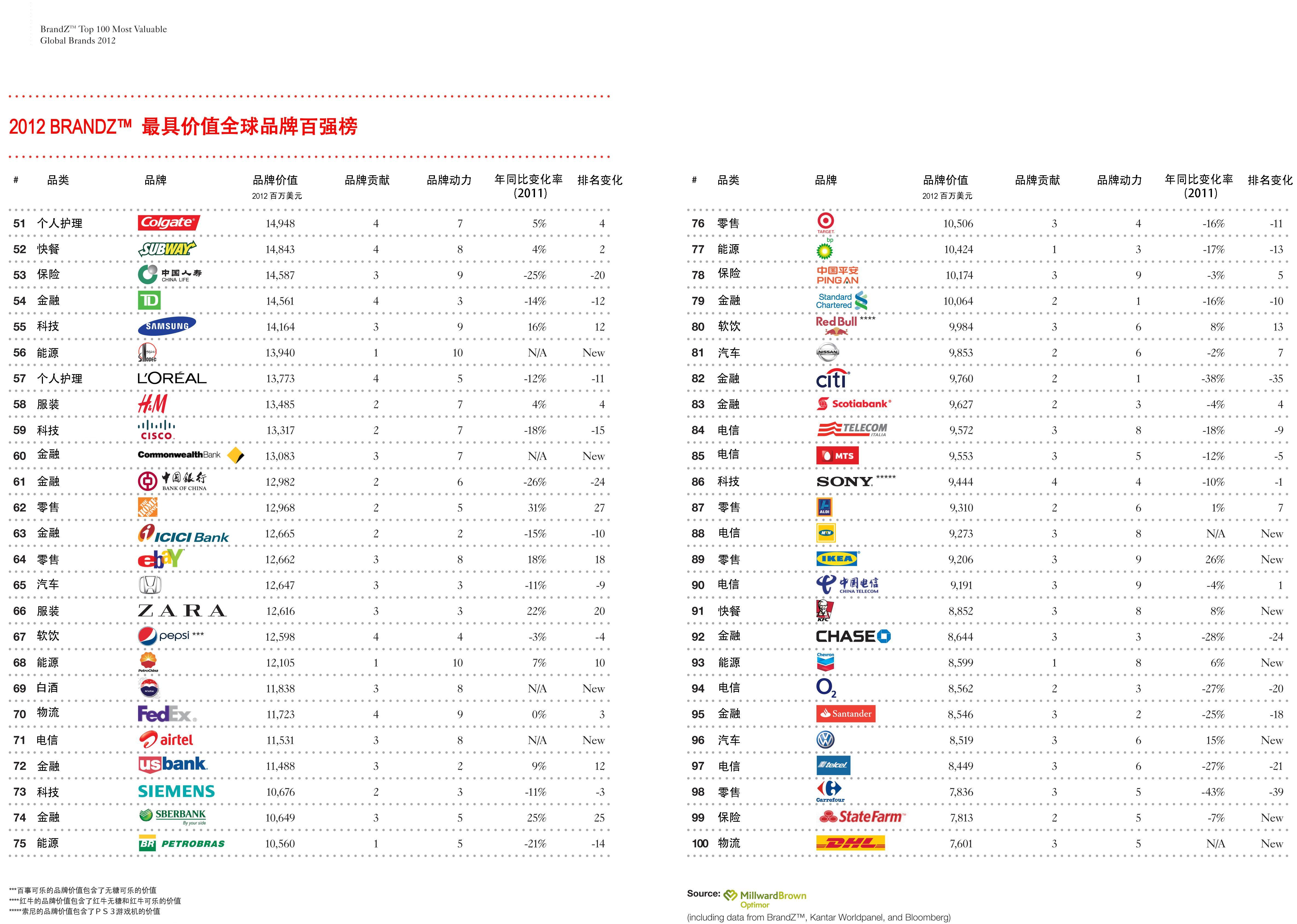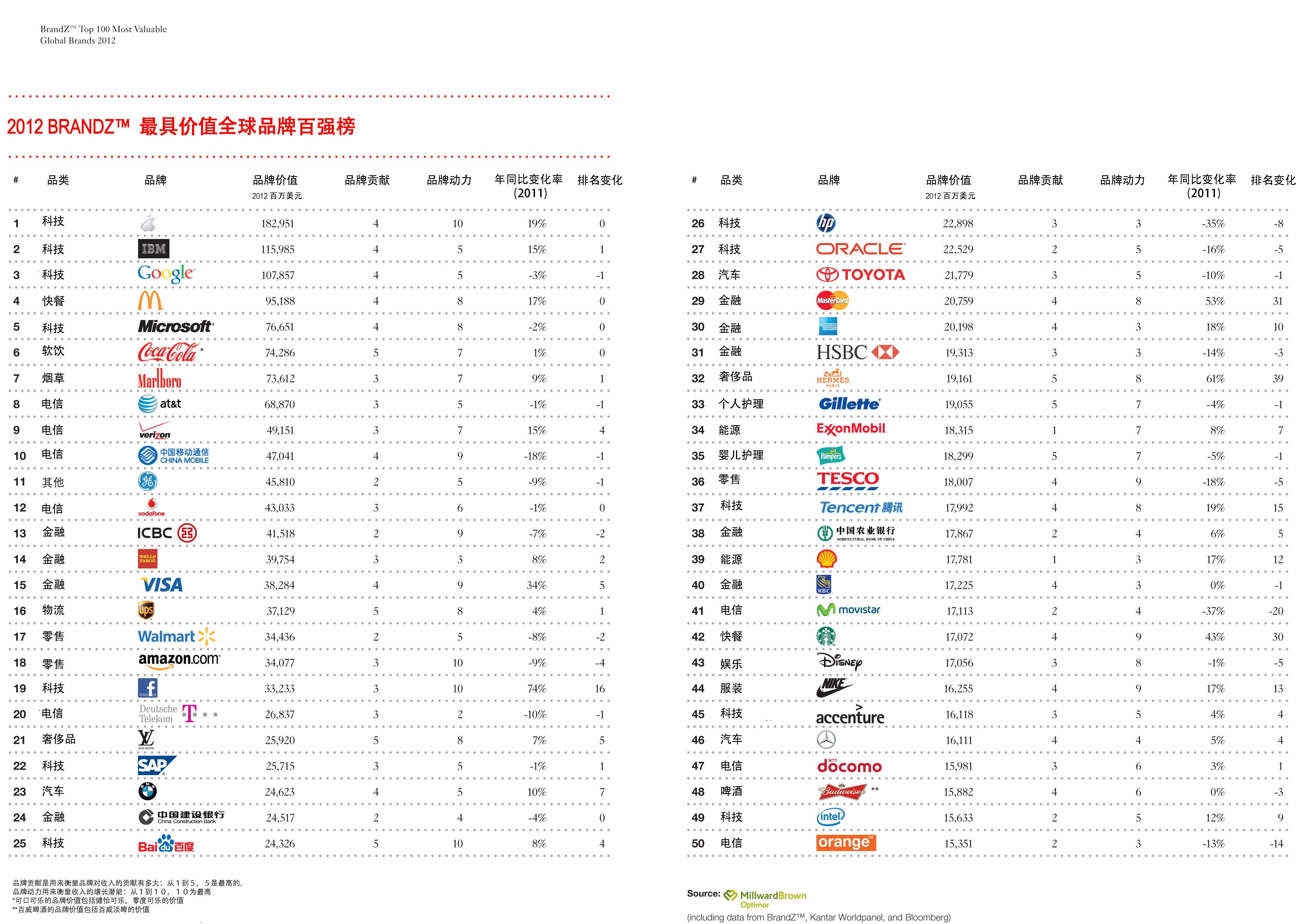 BrandZ 最具價值全球品牌百強(qiáng)調(diào)查不僅對財(cái)務(wù)數(shù)據(jù)、市場估價、分析報(bào)告和風(fēng)險預(yù)測進(jìn)行了縝密的分析,而且還考慮了消費(fèi)者的意見,這在全世界可謂絕無僅有。調(diào)查報(bào)告在互聯(lián)網(wǎng)上發(fā)布,內(nèi)容包括全球主要地區(qū)和 13 個市場領(lǐng)域的最具價值品牌排名結(jié)果及分析。單擊此處下載完整的 BrandZ 排行榜,其中包括地區(qū)和類別細(xì)分排名。排行榜及其他相關(guān)信息還通過免費(fèi)的蘋果及安卓交互式應(yīng)用程序或iPad 雜志提供。