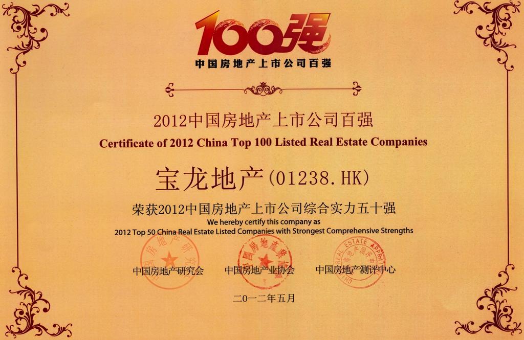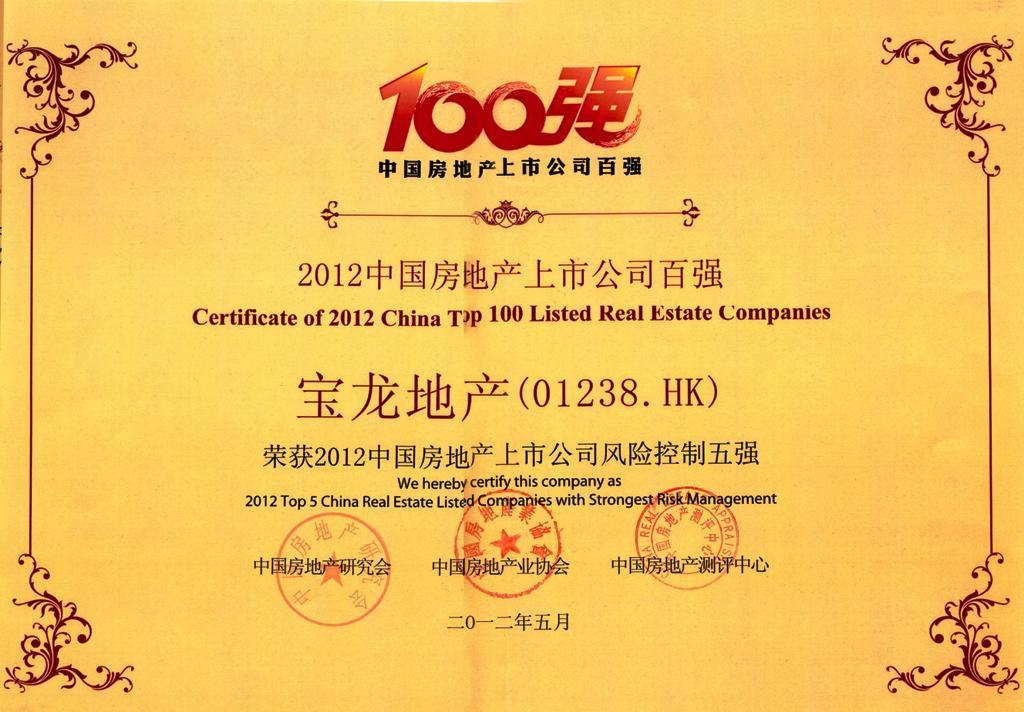 寶龍地產榮膺“2012中國房地產上市公司綜合實力50強”及“2012中國房地產上市公司風險控制五強”