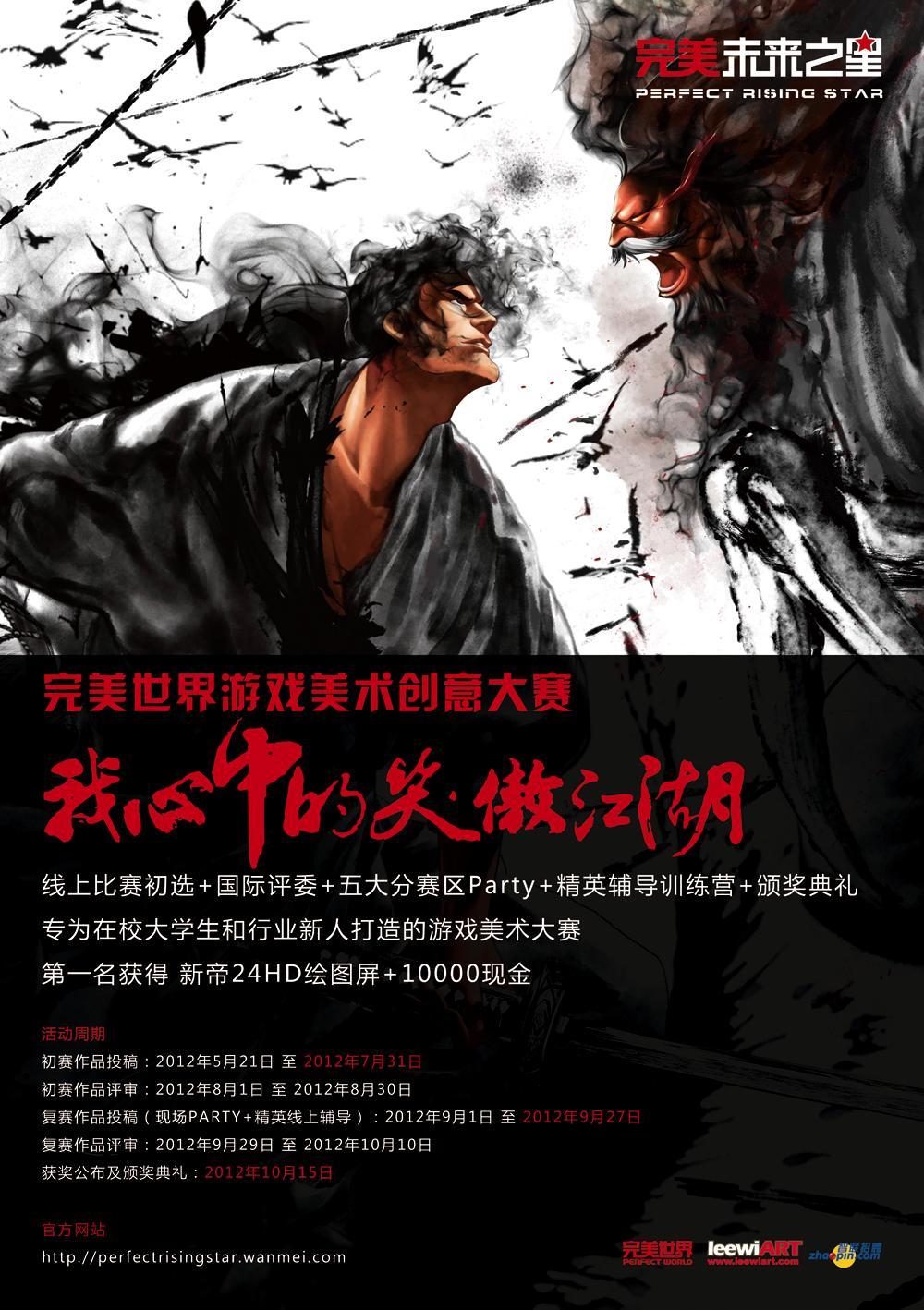 本次比賽是由完美世界主辦,leewiART 國(guó)際數(shù)字圖形藝術(shù)推廣機(jī)構(gòu)與智聯(lián)招聘共同承辦的藝術(shù)活動(dòng)。本次活動(dòng)面向在校大學(xué)生和剛工作不久的美術(shù)從業(yè)者,希望創(chuàng)作者可以本著開(kāi)放、自由、創(chuàng)造性的精神,并通過(guò)自身對(duì)于笑傲江湖文化的理解,創(chuàng)作出屬于自己的江湖世界,作品最終以插畫(huà)的形式體現(xiàn),風(fēng)格不限。比賽官方網(wǎng)站(http://perfectrisingstar.wanmei.com),比賽官方新浪微博(http://weibo.com/perfectrisingstar),比賽官方騰訊微博(http://t.qq.com/perfectrisingstar)也將在比賽啟動(dòng)日同期上線。
