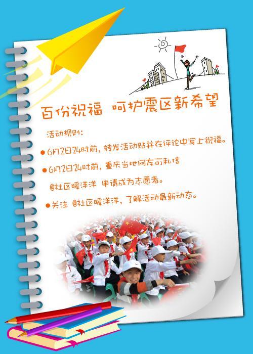 網(wǎng)友可以關(guān)注“@社區(qū)暖洋洋”,并在6月2日前在評(píng)論中寫(xiě)下對(duì)新金帶小學(xué)孩子們的兒童節(jié)祝福。沃爾瑪及員工志愿者為孩子們準(zhǔn)備了百套嶄新的文具,并將于“六一”之后回訪新金帶小學(xué)。屆時(shí)志愿者們會(huì)將征集到的網(wǎng)友祝福和文具、圖書(shū)等學(xué)習(xí)用品一起送到孩子們手中。重慶網(wǎng)友還可通過(guò)私信方式報(bào)名,部分網(wǎng)友代表將有機(jī)會(huì)同沃爾瑪志愿者一起參加回訪活動(dòng),親自為孩子們送去祝福。