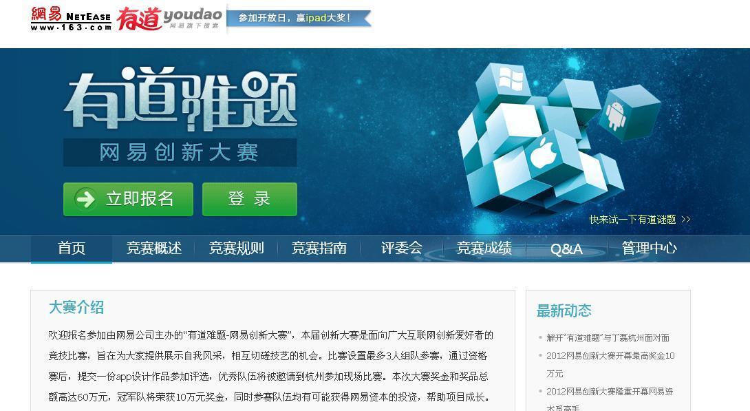 “有道難題”創(chuàng)新大賽是面向廣大互聯(lián)網(wǎng)創(chuàng)新愛好者的競(jìng)技比賽。旨在為有技術(shù)創(chuàng)新理想的人們提供切磋技藝、交流思想的機(jī)會(huì)。同時(shí),網(wǎng)易也希望人才庫(kù)會(huì)通過本次大賽而得到充實(shí)。與往屆單純的編程競(jìng)賽不同,本屆大賽圍繞移動(dòng)互聯(lián)網(wǎng)創(chuàng)新展開,進(jìn)入初賽的選手都將有機(jī)會(huì)一展自己在教育領(lǐng)域的APP開發(fā)潛力。