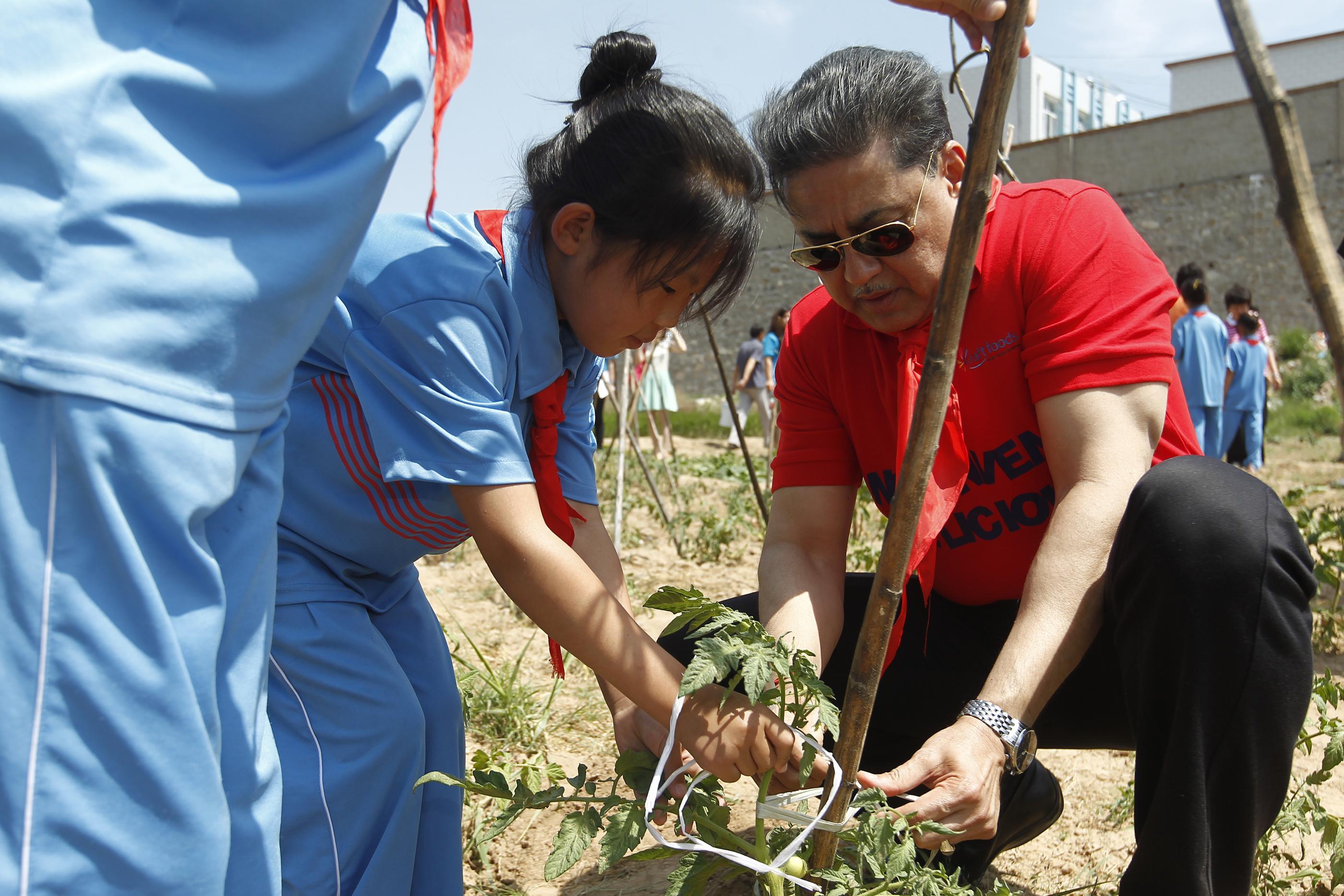 懷來(lái)縣孫莊子村距離首都北京僅2小時(shí)車程,在福和希望寄宿學(xué)校大多數(shù)的學(xué)生來(lái)自貧困家庭,學(xué)校食堂的供餐能力對(duì)學(xué)生健康成長(zhǎng)尤為關(guān)鍵??ǚ蚴称分驹刚叽诵谢卦L了該??ǚ蛳M麖N房的情況,聽取校方對(duì)項(xiàng)目的改進(jìn)建議,和學(xué)校師生一起在新建的“美味菜園”中搭架、澆水,在“卡夫希望廚房”親自為孩子們包餃子準(zhǔn)備午飯。