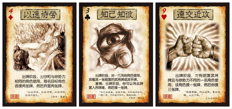 由此可見,《三國殺·國戰(zhàn)》以桌游的方式演繹了在一場多方勢力混雜的戰(zhàn)爭。用【以逸待勞】保存、提高自己的實力。用【知己知彼】一探身邊的神秘人物是敵是友、甚至摸清底細。用【遠交近攻】團結(jié)身邊的敵人,把他的優(yōu)勢變成自己的武器,去消滅那些容易消滅的敵人。而每一支錦囊何時出現(xiàn)、如何使用的安排、謀劃,會具有什么樣的威力、效果,就要看玩家的運籌帷幄了。