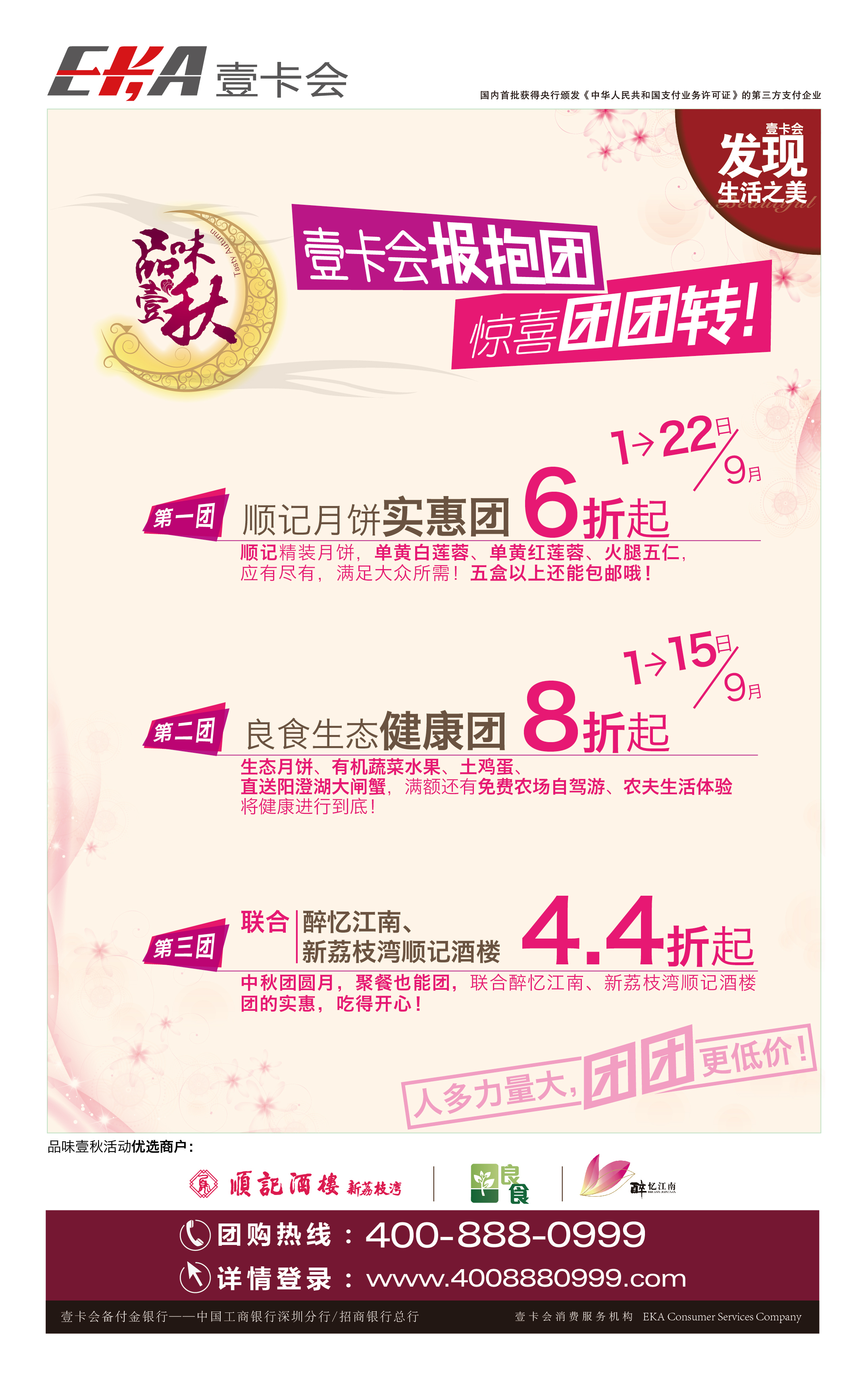 壹卡會·發(fā)現(xiàn)生活之美.品味壹秋大型團(tuán)購活動可接受企業(yè)或個人報團(tuán),詳詢400-888-0999或登錄www.4008880999.com進(jìn)行自助團(tuán)購。(活動僅限深圳地區(qū))