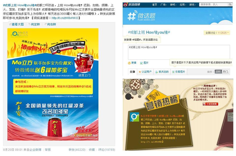 有成都最嗨吃喝玩樂(lè)網(wǎng)站之稱(chēng)的O2O移動(dòng)電子商務(wù)平臺(tái)Mo立方,攜手全國(guó)銷(xiāo)量領(lǐng)先的紅罐涼茶加多寶,值成都二環(huán)擁堵,全城“大火”蔓延之際,在8月20日,通過(guò)Mo立方官方微博趁勢(shì)推出#成都上班 How堵you堵#降火行動(dòng),成都上班族微博用戶(hù)只要轉(zhuǎn)發(fā)Mo立方活動(dòng)微博,即可贏取6罐加多寶,Mo立方每天送出3000罐,直接送獎(jiǎng)上門(mén),活動(dòng)持續(xù)一周時(shí)間。