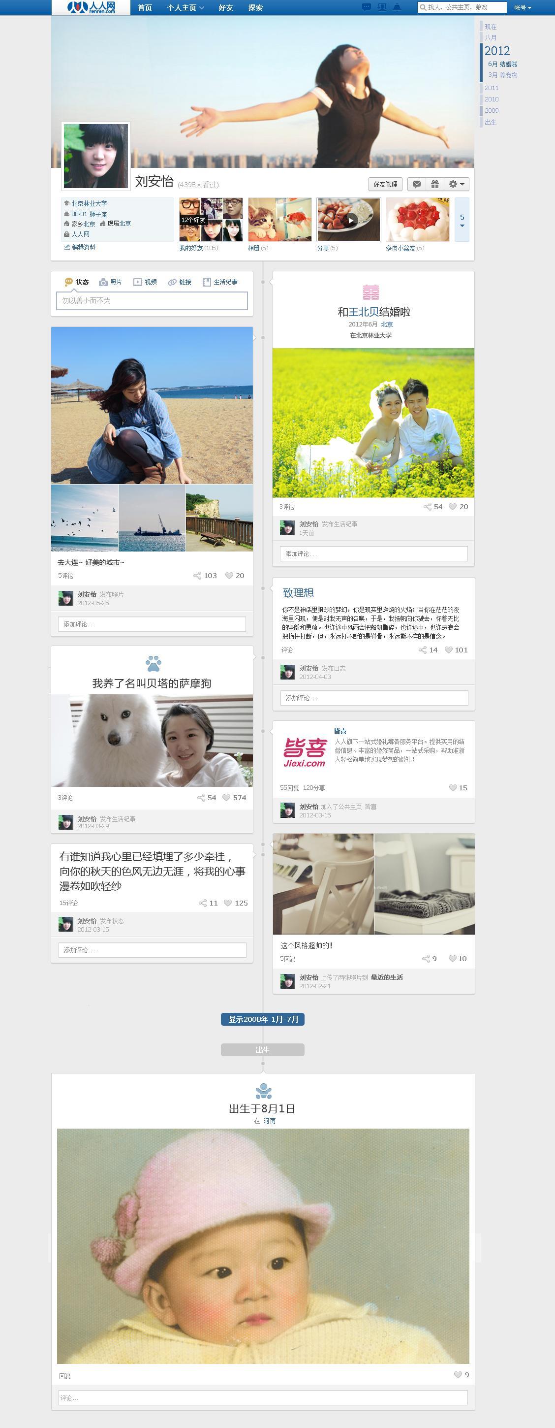人人時(shí)間軸的推出讓人人網(wǎng)個(gè)人主頁(yè)有了全新的展現(xiàn)形式,用戶可以通過自定義封面、添加生活紀(jì)事、記錄足跡等功能,在人人網(wǎng)上記錄自己從出生那一天起的人生軌跡。不僅如此,人人時(shí)間軸還會(huì)將用戶在人人網(wǎng)上發(fā)布的所有內(nèi)容按照時(shí)間順序重新排布,無(wú)論是出生還是結(jié)婚,戀愛或是旅行,人人時(shí)間軸都會(huì)用最精致的展現(xiàn)方式賦予每一位用戶獨(dú)特的故事,真正實(shí)現(xiàn)了一樣的時(shí)間,不一樣的時(shí)間軸。與此同時(shí),人人時(shí)間軸簡(jiǎn)約清爽的頁(yè)面風(fēng)格也與人人網(wǎng)首頁(yè)保持了一致。