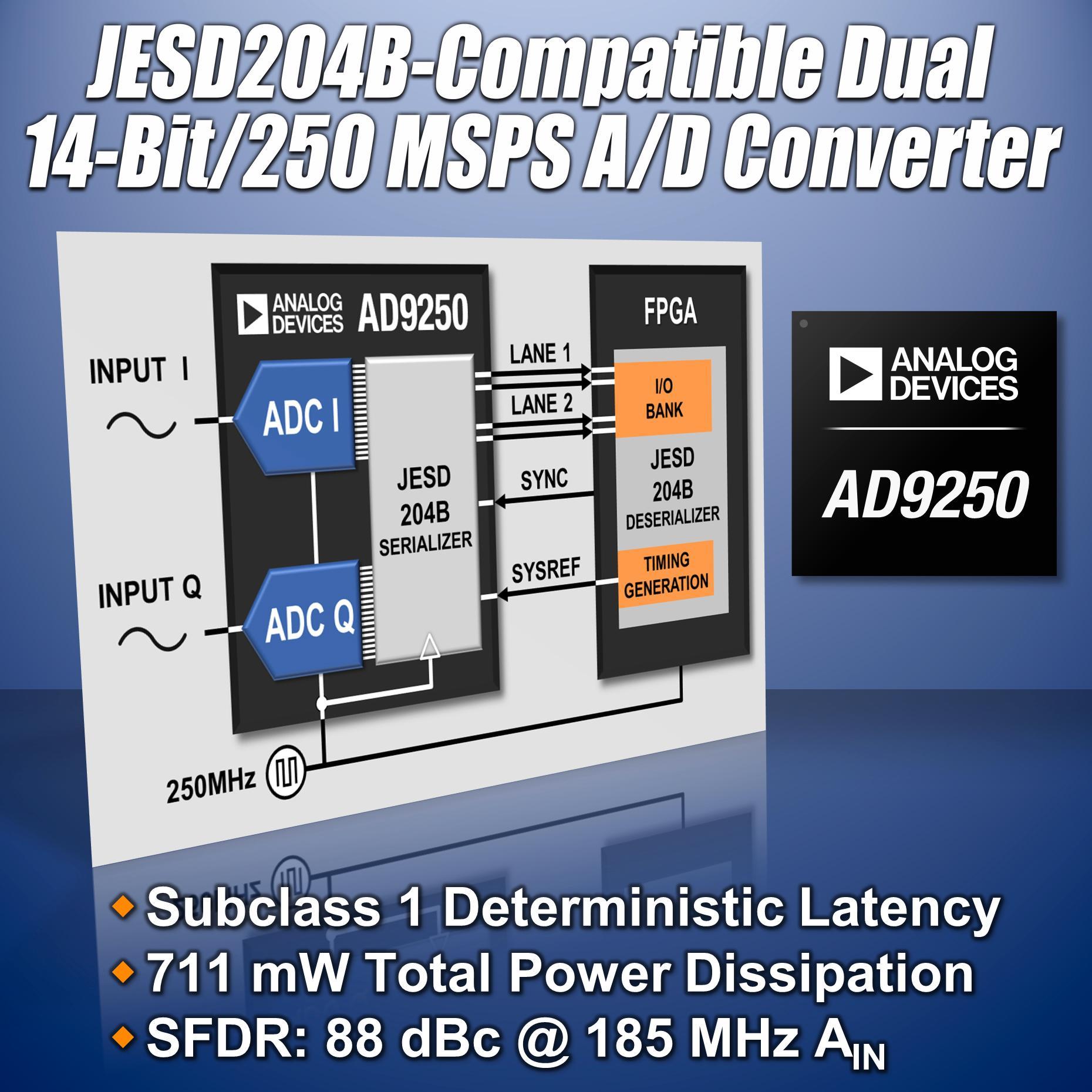 新型雙通道14位250 MSPS ADC AD9250通過JESD204B兼容輸出與高速FPGA無縫連接,并支持精密多通道轉換器同步。