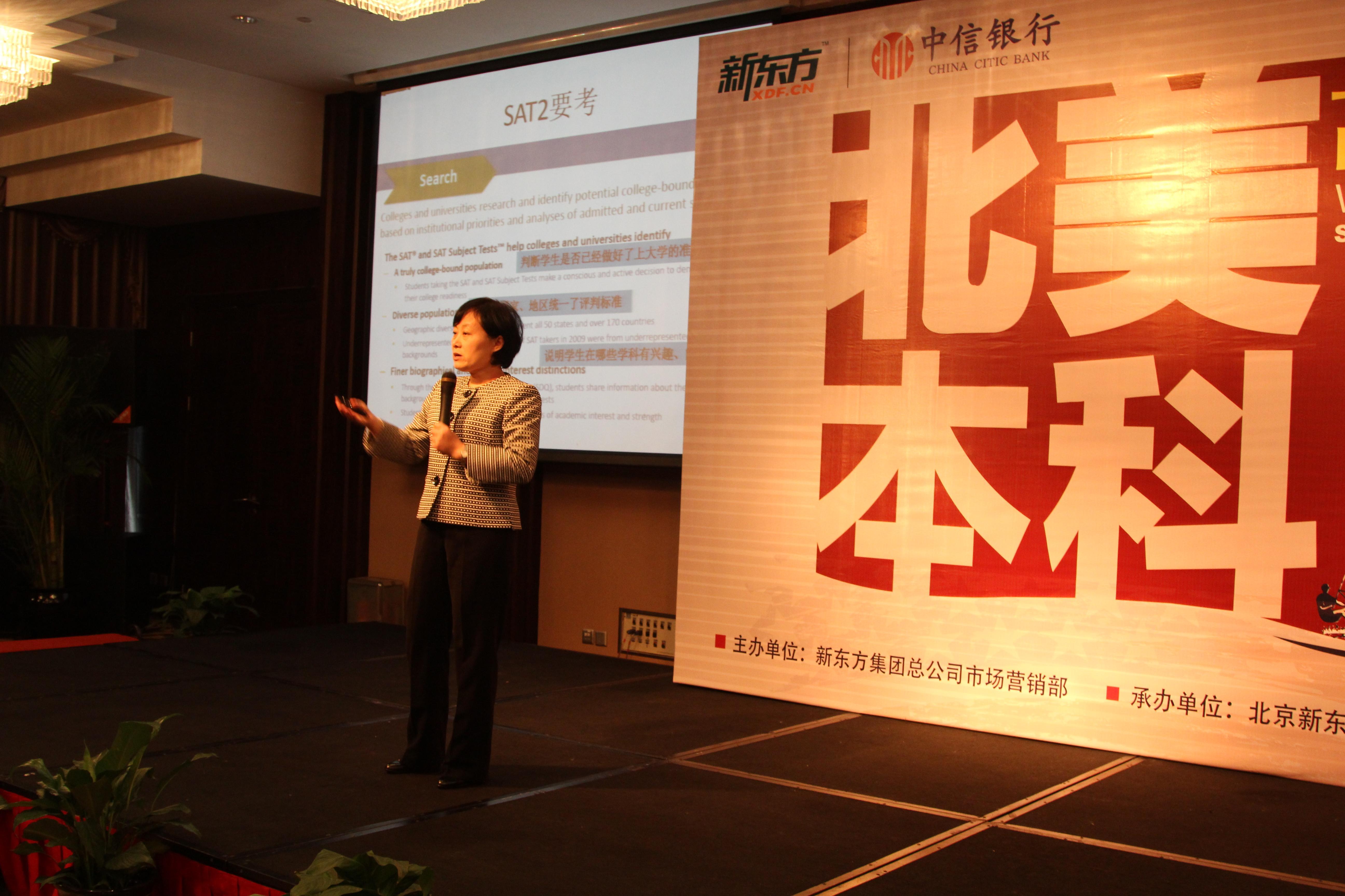 來自北京新東方的托福、SAT高分學員還在現(xiàn)場分享了自己的備考經(jīng)驗。來自北京171中學的張同學取得了托??荚?11分,SAT考試2210 的好成績。他介紹,之所以取得較好的成績在于兩點,一是考試之前長時間的積累,二是考前短期熟悉考試形式。平時多聽VOA、多背誦美文、多讀英文小說并通過“自言自語”的方式練習口語是平時提高英語水平的方法。而在SAT考試中,張同學則建議大家大量閱讀,掌握單詞并大量做題掌握考試形式。來自北京八中的郭同學取得了托福117分、SAT2260分的好成績。她介紹,面對考試平時的積累最為重要。面對SAT閱讀,一定要養(yǎng)成好的閱讀習慣,客觀面對自己的英文水平并挑選適合自己的、感興趣的英文書籍進行閱讀以便提高閱讀速度。而面對數(shù)學單項,中國的學生尤為注意的是不要粗心。面對寫作單項,除了要做好閱讀積累還要對語法有扎實的掌握。