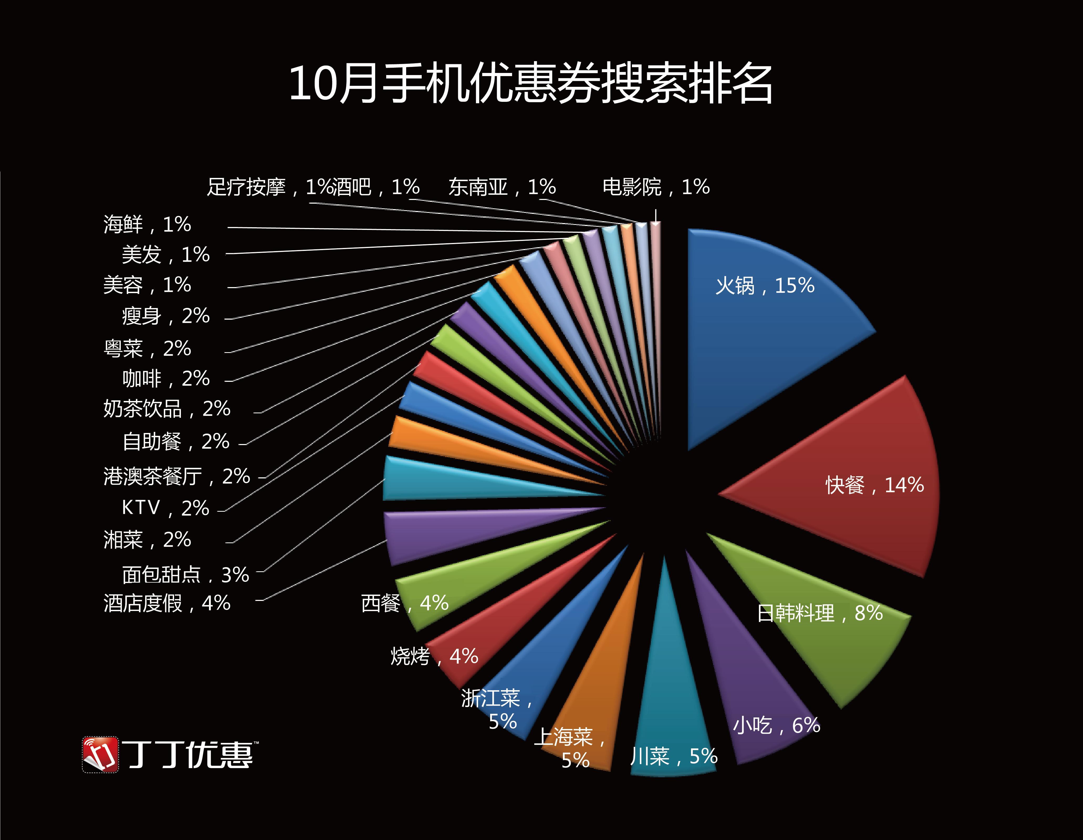 上海2012年11月8日電 /美通社/ -- 今日,國內(nèi)較大的手機優(yōu)惠券 APP -- 丁丁優(yōu)惠發(fā)布2012年10月份手機優(yōu)惠券指數(shù)。十月份受國慶中秋雙節(jié)消費刺激,手機優(yōu)惠券的使用率呈明顯上升,特別表現(xiàn)在“酒店旅游”以及“小吃快餐”類別,均有大幅的提高。此外,秋冬季節(jié)更替,隨著天氣越來越趨于寒冷,火鍋、燒烤的需求逐漸抬頭。
