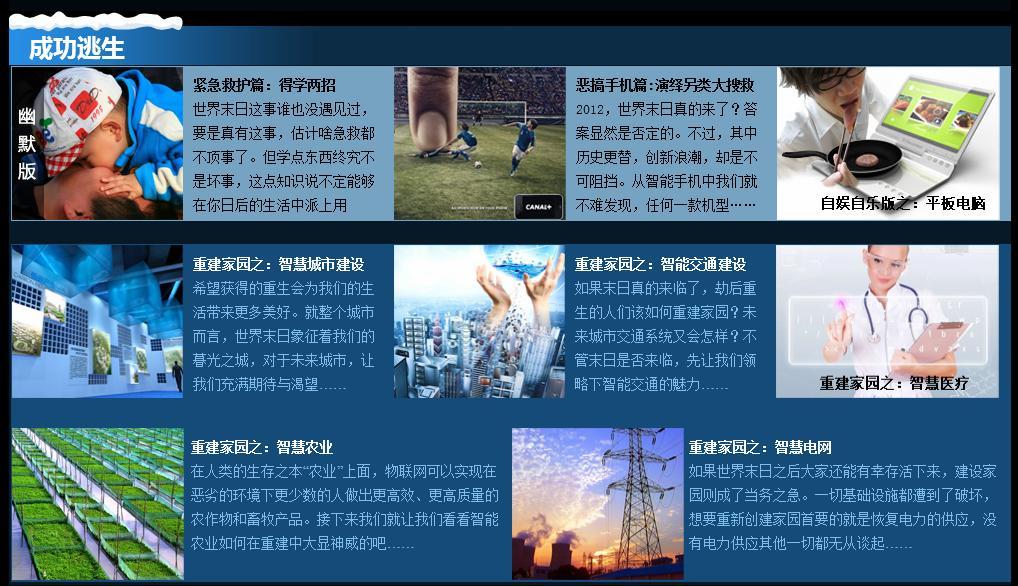 物聯(lián)中國“世界末日科技逃生大攻略”專題主要分為“逃生指南、必備清單、微博有獎轉(zhuǎn)發(fā)、制高點(diǎn)、避難所、諾亞方舟、成功逃生、重建家園、未發(fā)生災(zāi)難、網(wǎng)友互動”十大版塊,內(nèi)容只能以“各種搞笑”來形容。