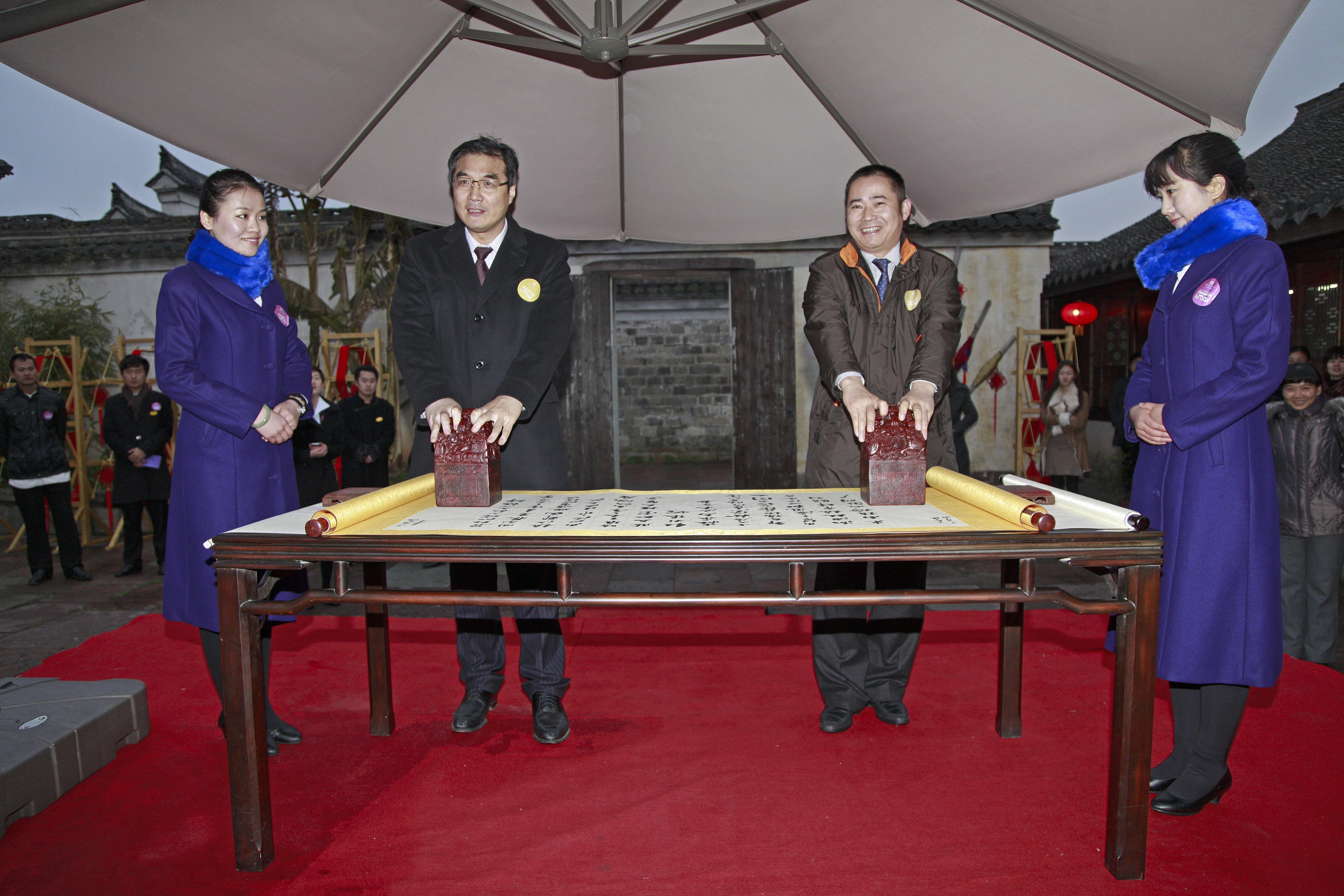 鎮(zhèn)海區(qū)副區(qū)長王兆波和開元旅業(yè)集團(tuán)總裁陳燦榮分別代表各方在現(xiàn)場簽了約。最后,鎮(zhèn)海區(qū)委書記薛維海和開元旅業(yè)集團(tuán)董事長陳妙林一起走上龍鳳臺,為掛在臺梁柱上的大紅綢結(jié)彩,寓示兩家成功“聯(lián)姻”。