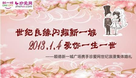 廣州2012年12月31日電 /美通社/ -- 在百年難得一遇的幸福起點(diǎn),擁有真愛恒久流傳的浪漫回憶,是單身男女都期盼著的幸福人生。2013年1月4日,順德新一城攜手中國較大的相親網(wǎng)站珍愛網(wǎng) (zhenai.com) 在佛山順德新一城廣場舉辦的“世紀(jì)良緣閃耀新一城,2013.1.4愛你一生一世”世紀(jì)浪漫集體婚禮即將濃情啟幕,為新人締造一場甜蜜浪漫的世紀(jì)回憶。