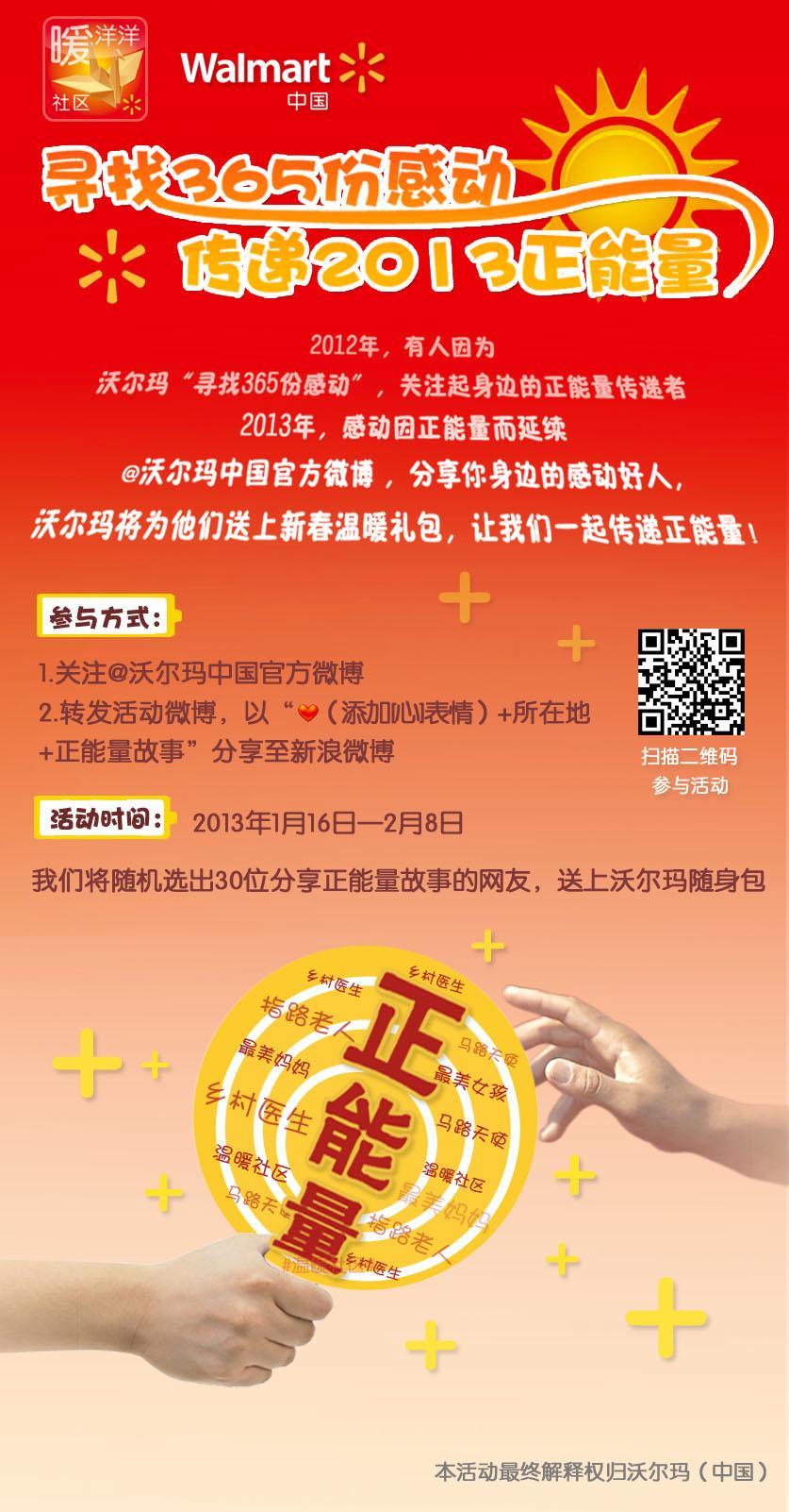 2012年,沃爾瑪“@社區(qū)暖洋洋 - 尋找365份感動(dòng)”讓我們認(rèn)識(shí)了這些“正能量”傳遞者,包括免費(fèi)搭載老弱病殘的大連司機(jī)顧慶泰,大火中喚醒鄰居的“草根小英雄”南昌女孩夏娟,北京天翔社區(qū)年近70歲的社區(qū)服務(wù)志愿者、熱心腸的郭阿姨,以及沈陽(yáng)身患五種癌癥卻義務(wù)管理社區(qū)全樓大小事務(wù)的張鳳歧大伯……他們平凡而偉大的草根公益之愛(ài)將使蛇年的春節(jié)更加充滿(mǎn)溫暖。2013年,感動(dòng)將會(huì)因正能量而繼續(xù)延續(xù)。
