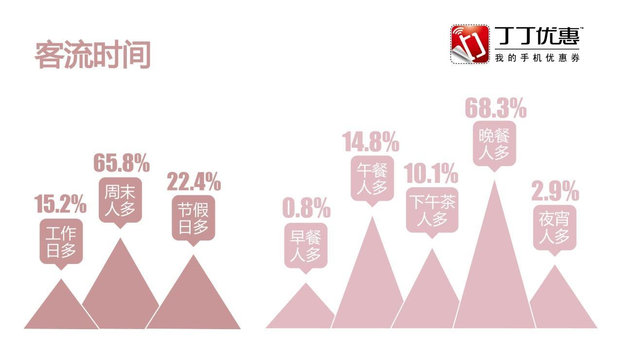 受都市白領休閑作息規(guī)律影響,餐飲店客流呈現日晚餐高峰和周六日節(jié)假日雙高峰表現,其中60%以上客流來自于這兩個時段。調查也發(fā)現,對于某些邊際市場的空間還有待挖掘,比如高新科技園區(qū)和工業(yè)園區(qū)甚至某些高密度寫字樓商圈,白領高密度聚集地需求量相應旺盛,午餐雖單次消費總額不高,但是勝在量大。