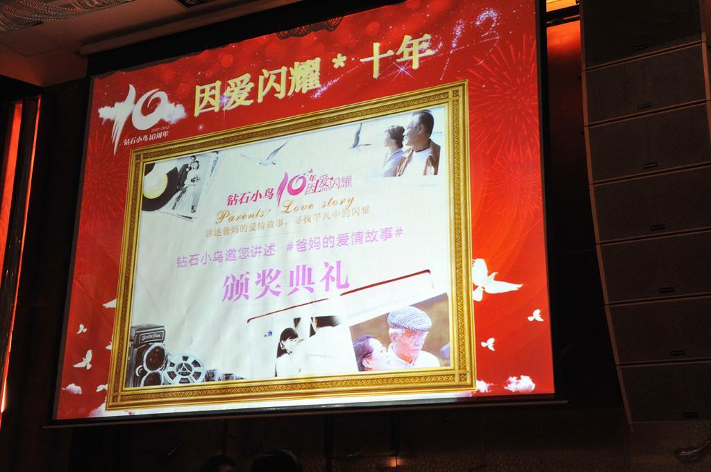 一位來自浙江紹興叫陸丹的女孩,在@鉆石小鳥上看見,鉆石小鳥征集“十年關于爸媽的愛情故事”,便將自己的父母的愛情故事以140字的微博參與了征集活動,最終在收集到的上千條愛情故事中,被ELLE、瑞麗、悅己等數家媒體作為具有代表性的平凡人的愛情故事挑選出來,這位女孩兒和她的父母都被特別邀請到鉆石小鳥品牌十周年的慶典現(xiàn)場。