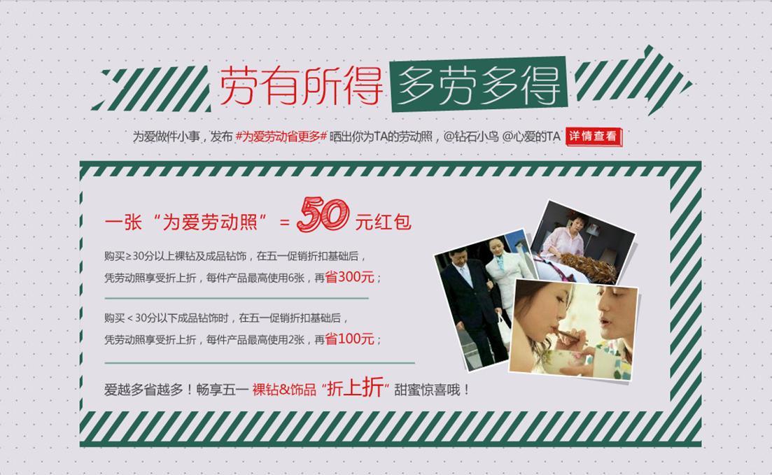 “愛(ài)情任務(wù)”也是非常有趣的環(huán)節(jié)。愛(ài)人之間哪怕一些小的舉動(dòng)都會(huì)令對(duì)方感動(dòng)不已,而作為一個(gè)稱職的愛(ài)人是否在這個(gè)勞動(dòng)節(jié)對(duì)對(duì)方有所表示呢?你為對(duì)方斟了一杯香濃的咖啡抑或做了一桌可口的飯菜,或者喂對(duì)方吃了一口心儀的甜品。在微博上曬一張勞動(dòng)照片并@鉆石小鳥,就可得50元現(xiàn)金抵用券,愛(ài)心付出越多,收獲也將會(huì)更多。在活動(dòng)期間至鉆石小鳥各地體驗(yàn)中的消費(fèi)者也能現(xiàn)場(chǎng)完成任務(wù)表達(dá)愛(ài)意。