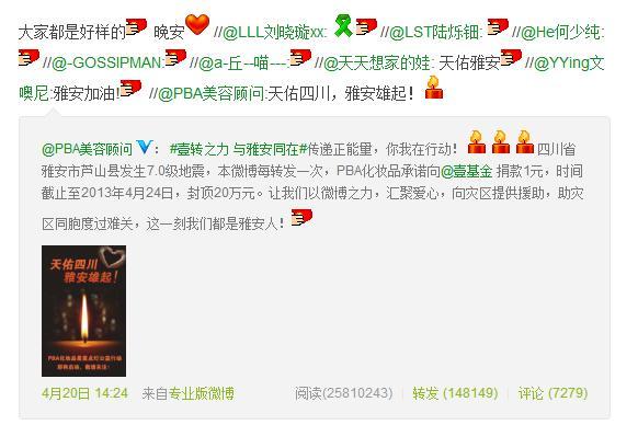 PBA充分發(fā)揮自身互聯(lián)網(wǎng)企業(yè)的特點(diǎn),立即啟動(dòng)#壹轉(zhuǎn)之力 與雅安同在#微博愛(ài)心籌款活動(dòng),號(hào)召網(wǎng)友傳遞正能量,匯聚愛(ài)心,向?yàn)?zāi)區(qū)提供援助,助災(zāi)區(qū)同胞度過(guò)難關(guān)。