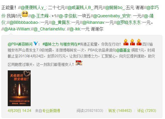 微博愛(ài)心籌款活動(dòng)推出僅16小時(shí)轉(zhuǎn)發(fā)人數(shù)即已超過(guò)12萬(wàn)人次,得到了網(wǎng)友的大力支持,抗震救災(zāi)刻不容緩,PBA化妝品當(dāng)即果斷決定提前代表所有支持愛(ài)心籌款活動(dòng)的網(wǎng)友和全體PBA會(huì)員捐出善款。