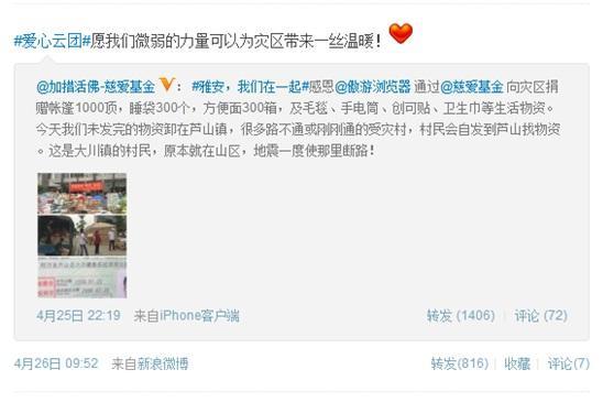 目前,傲游向四川災(zāi)區(qū)捐贈救災(zāi)物資的工作正在緊張開展。委托@加措活佛-慈愛基金 向災(zāi)區(qū)捐贈了帳篷1000頂,睡袋300個,方便面300箱,創(chuàng)可貼300包,以及若干毯子、雨衣、女性用品、手電筒、幼兒用品等災(zāi)區(qū)急需物資。并且在物資采購到位后,傲游還派出一名專業(yè)的傲游志愿者深入災(zāi)區(qū),協(xié)助基金會進行救助活動,一同保障物資能以較快速度送達(dá)災(zāi)區(qū)。在災(zāi)難面前,傲游用切實的行動展現(xiàn)了互聯(lián)網(wǎng)企業(yè)在危難時刻的擔(dān)當(dāng)。