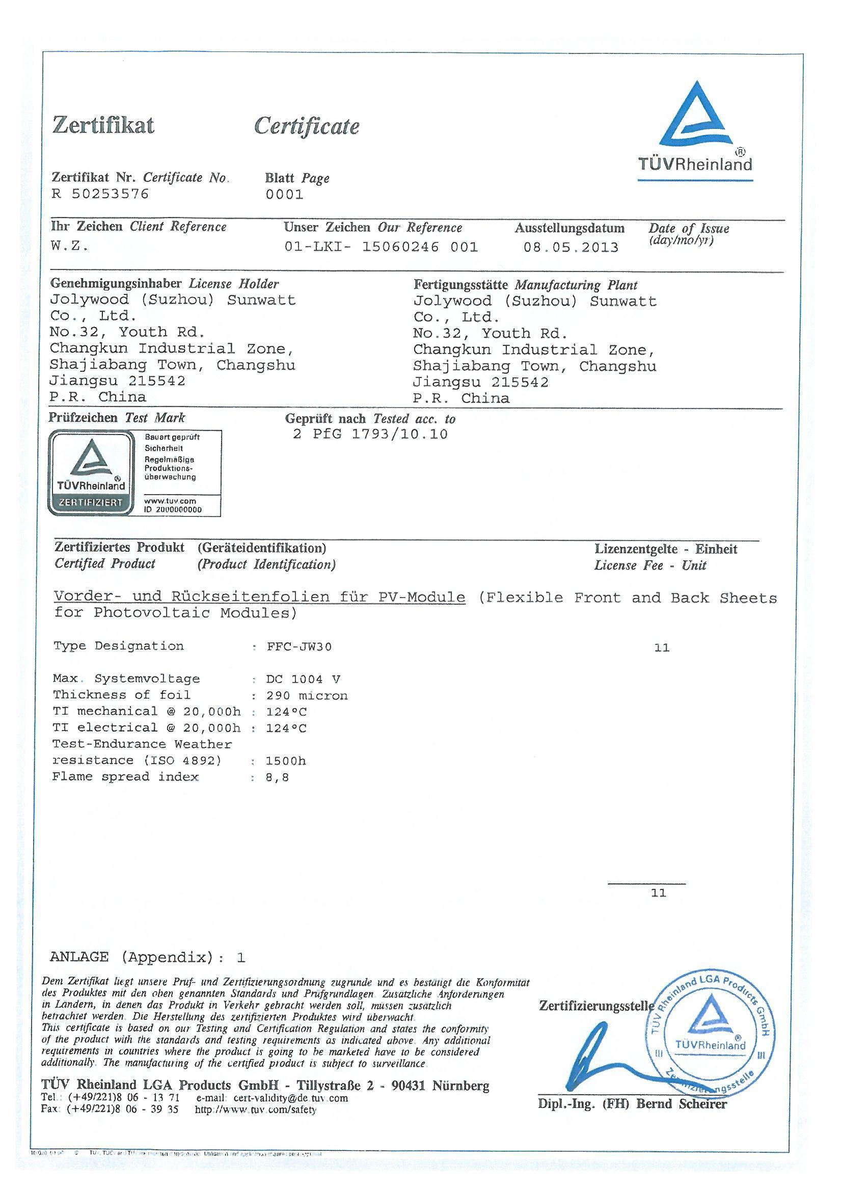 德國萊茵TUV頒發(fā)大中華區(qū)首張?zhí)柲鼙嘲遄C書,填補了太陽能背板長期以來產品認證的空白。長期以來,廣大組件廠商只有依靠局部放電報告來對太陽能背板進行要求和選擇,這樣無疑在材料特性以及老化特性(尤其長期相對熱指數(shù)和光老化)等方面留下了極大的隱患。在沒有相關國際標準的前提下,德國萊茵TUV根據(jù)太陽能光伏產品特性,基于2PfG1793/10.10的標準對太陽能背板提出了新的要求,以保障其安全性。測試條目包括背板的機械性能、材料熱特性、化學特性等,同時也包括了對材料相對熱指數(shù)(RTI)、火焰?zhèn)鞑ブ笖?shù),電性能(局部放電測試)等的測試。